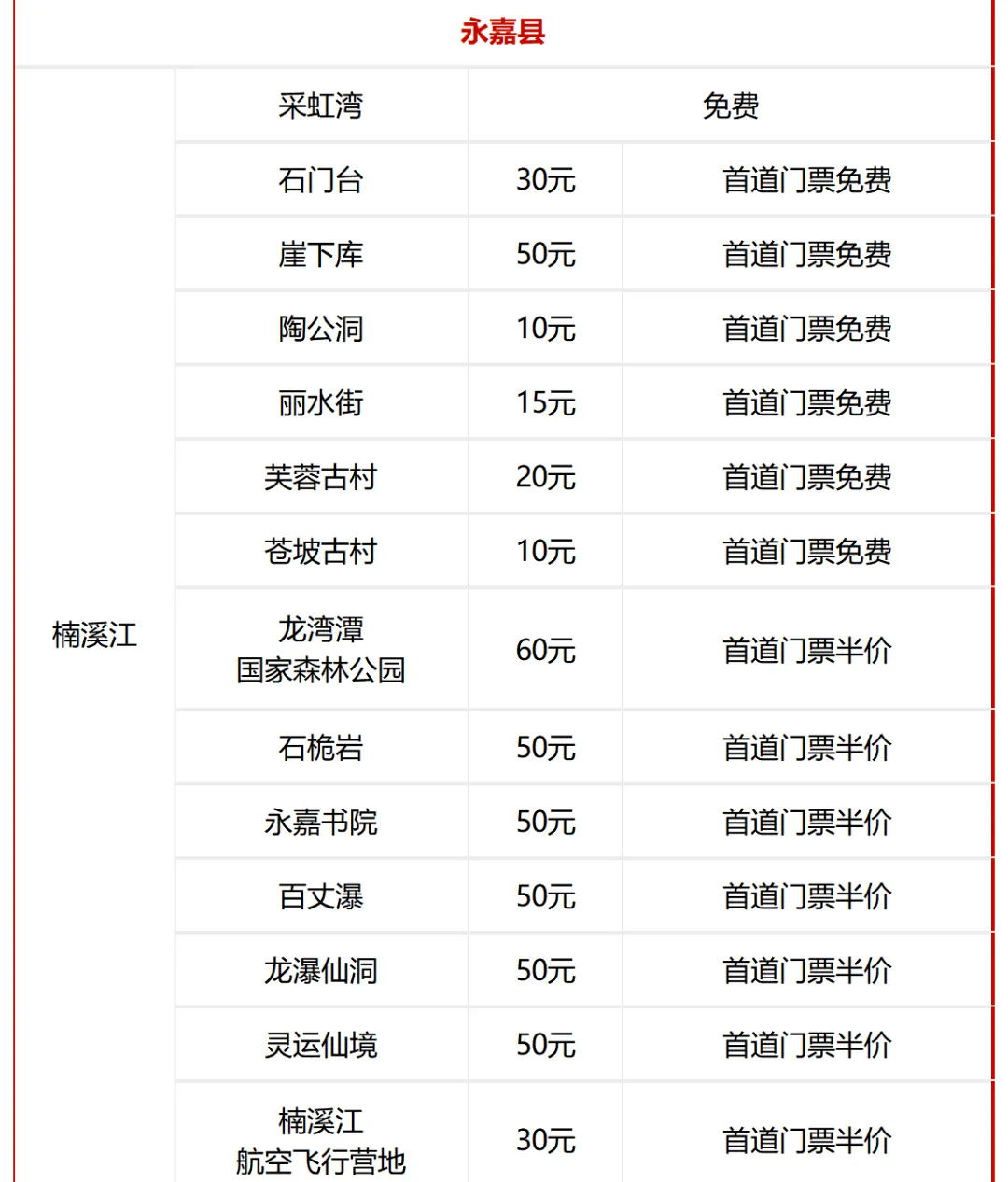 首道门票半价景区:龙湾潭国家森林公园、石桅岩、永嘉书院、百丈瀑、龙瀑仙洞、灵运仙境、楠溪江航空飞行营地