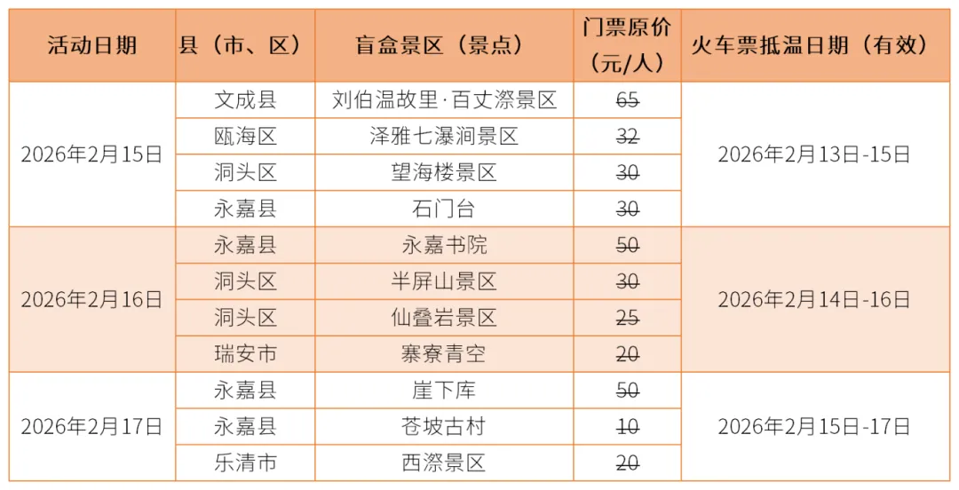 作为“来温州 享温暖”文旅IP的重磅福利,今年春节推出火车票免费游景区盲盒计划,2月15日至2月23日期间,每天上线3-4个“盲盒景区”,来温游客凭3天内市外抵温火车票及本人身份证原件即可免费游览政策内对应景区(景点)。春节长假期间,全市共计30个景区(景点)参与活动。