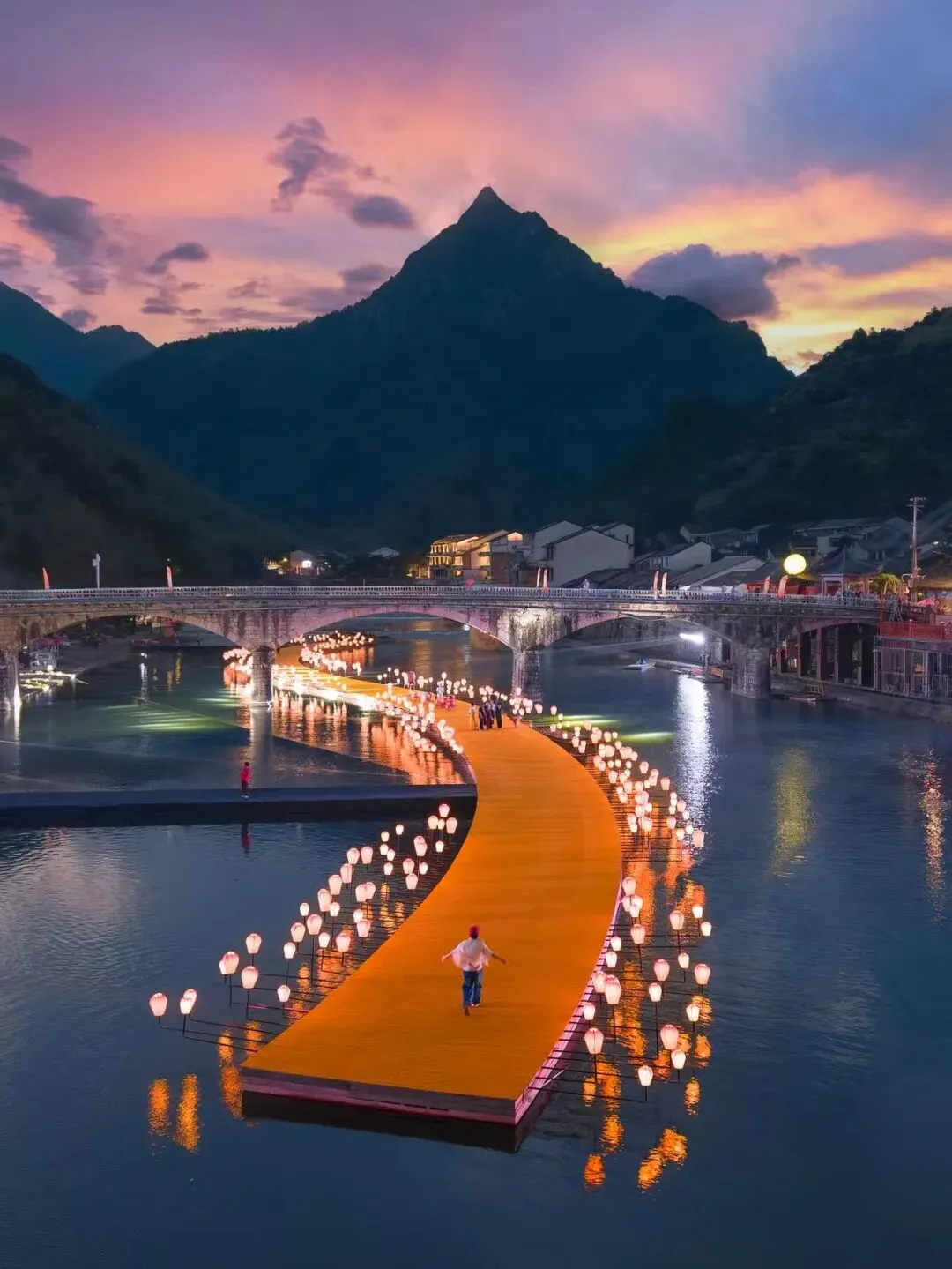 • 雁荡仙踪实景剧场:项目创新设计三种观演体验→船上就近观影、岸上平视观影以及VIP看台全景观影,打造中国首个跨度超过250米的跨江3D威亚表演和40米高莲花水幕塔。融合雁荡山历史传说、山水风光和文化演出,为游客提供震撼的视听体验和文化盛宴。
