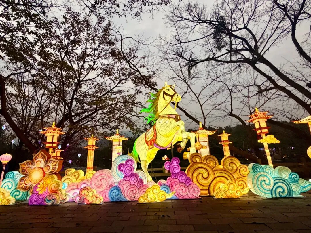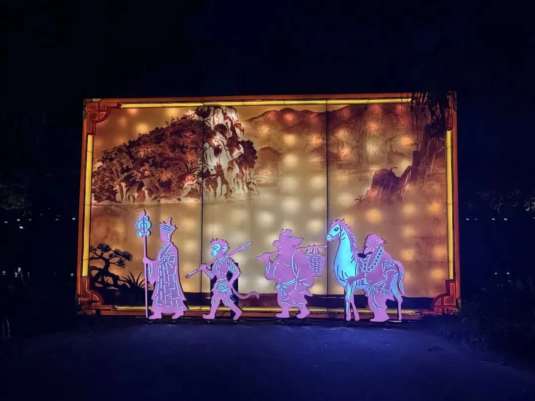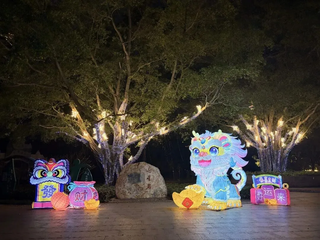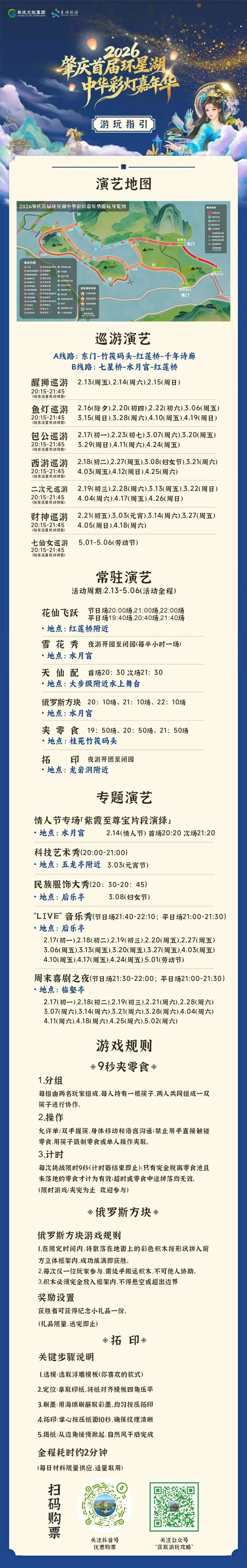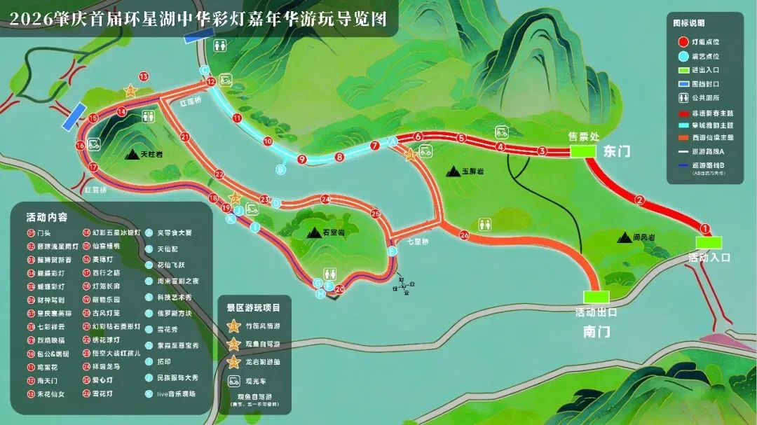 东门入口→非遗新春主题灯组(醒狮贺新春、财神驾到等)→夹零食互动→肇城雅韵主题段(裹蒸粽、包公&端砚等)→天仙配表演→花仙飞跃表演→西游仙境主题段(南天门、禾花仙女、仙女蟠桃等)→拓印非遗体验区→雪花秀→俄罗斯方块→科技艺术秀→爱心灯→周末喜剧之夜→ 祥瑞龙马→悟空大战红孩儿→绣球花灯→焕彩钻石菱形灯→南门出口