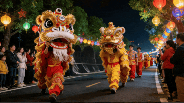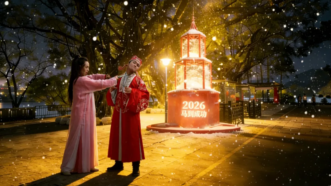 东门入口→非遗新春主题灯组(醒狮贺新春、财神驾到等)→夹零食互动→肇城雅韵主题段(裹蒸粽、包公&端砚等)→天仙配表演→花仙飞跃表演→西游仙境主题段(南天门、禾花仙女、仙女蟠桃等)→拓印非遗体验区→雪花秀→俄罗斯方块→南门出口