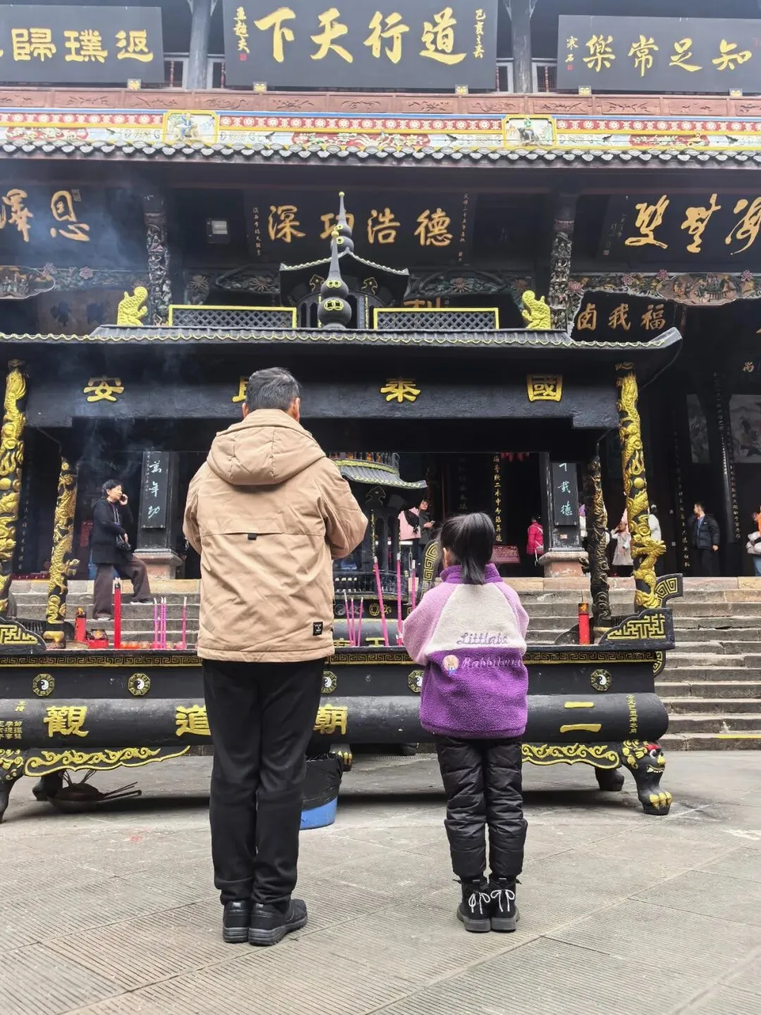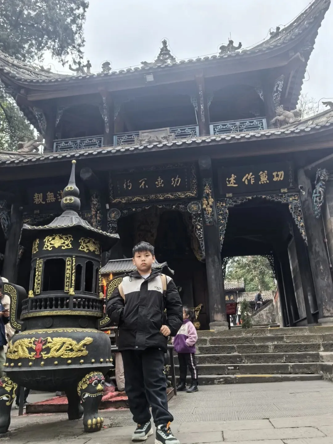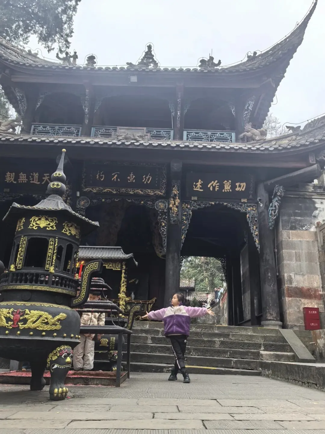 我带孩子旅游,更重视历史文化古迹,所以当然毫不犹疑的选择前山。爬山的方式,考虑到晚上要回成都,担心时间不够,我们选择缆车上山,徒步下山。但从心里上来说,我更倾向于徒步上下山,两个孩子经常跟我去徒步爬山,他们的体力和毅力完全没有问题,去年国庆我还带孩子爬了衡山。