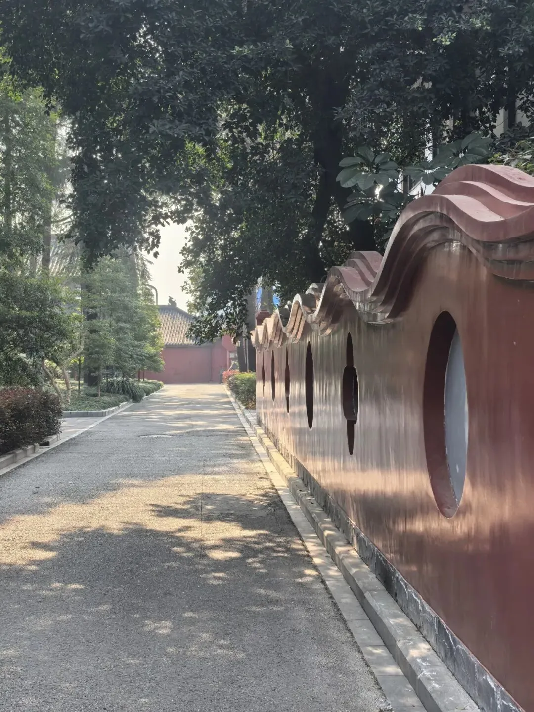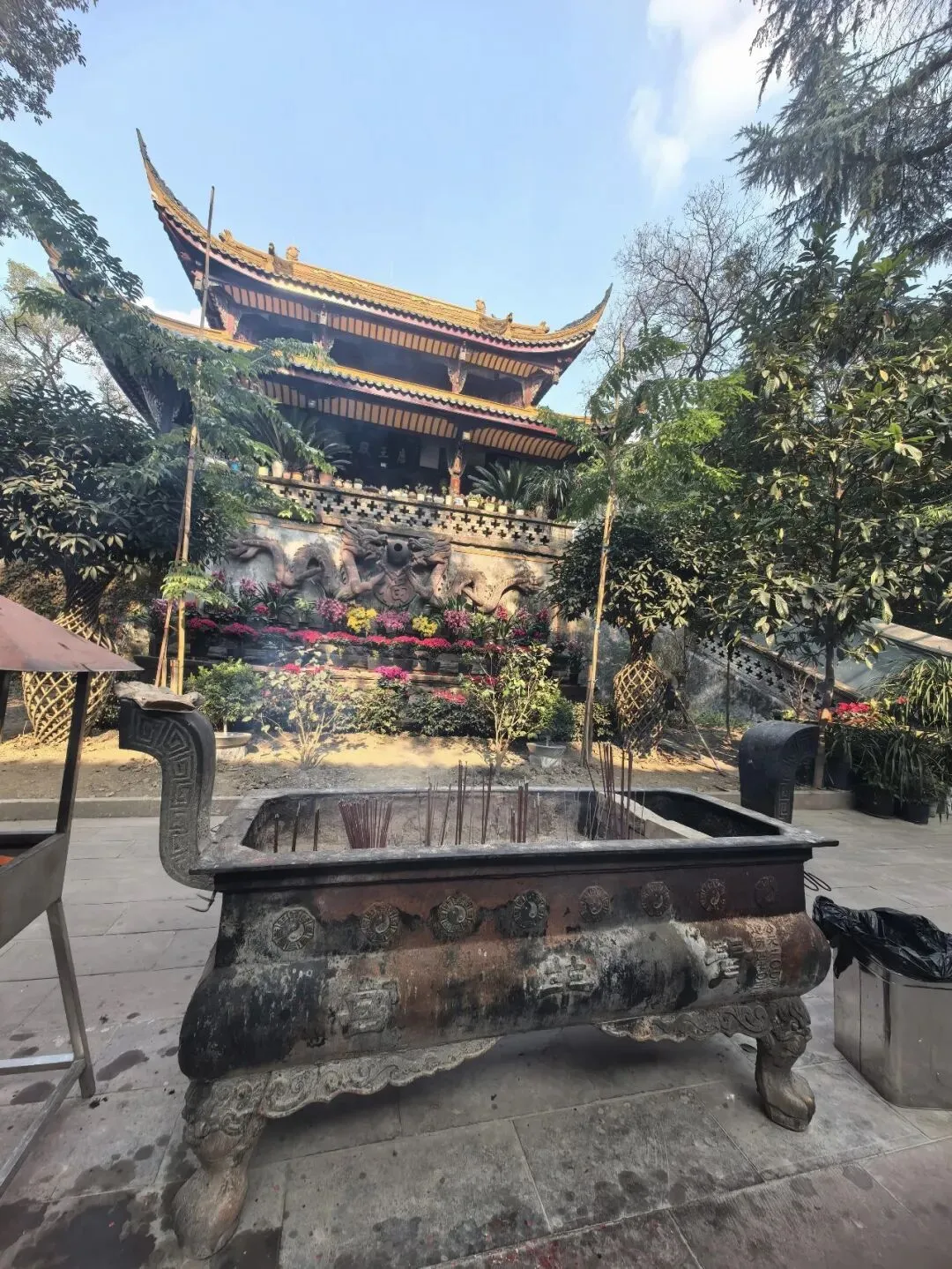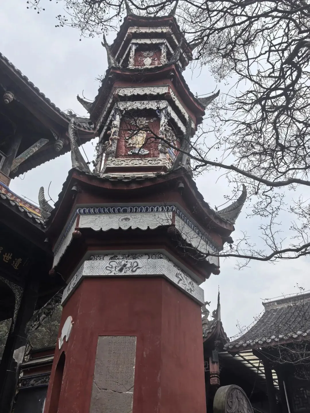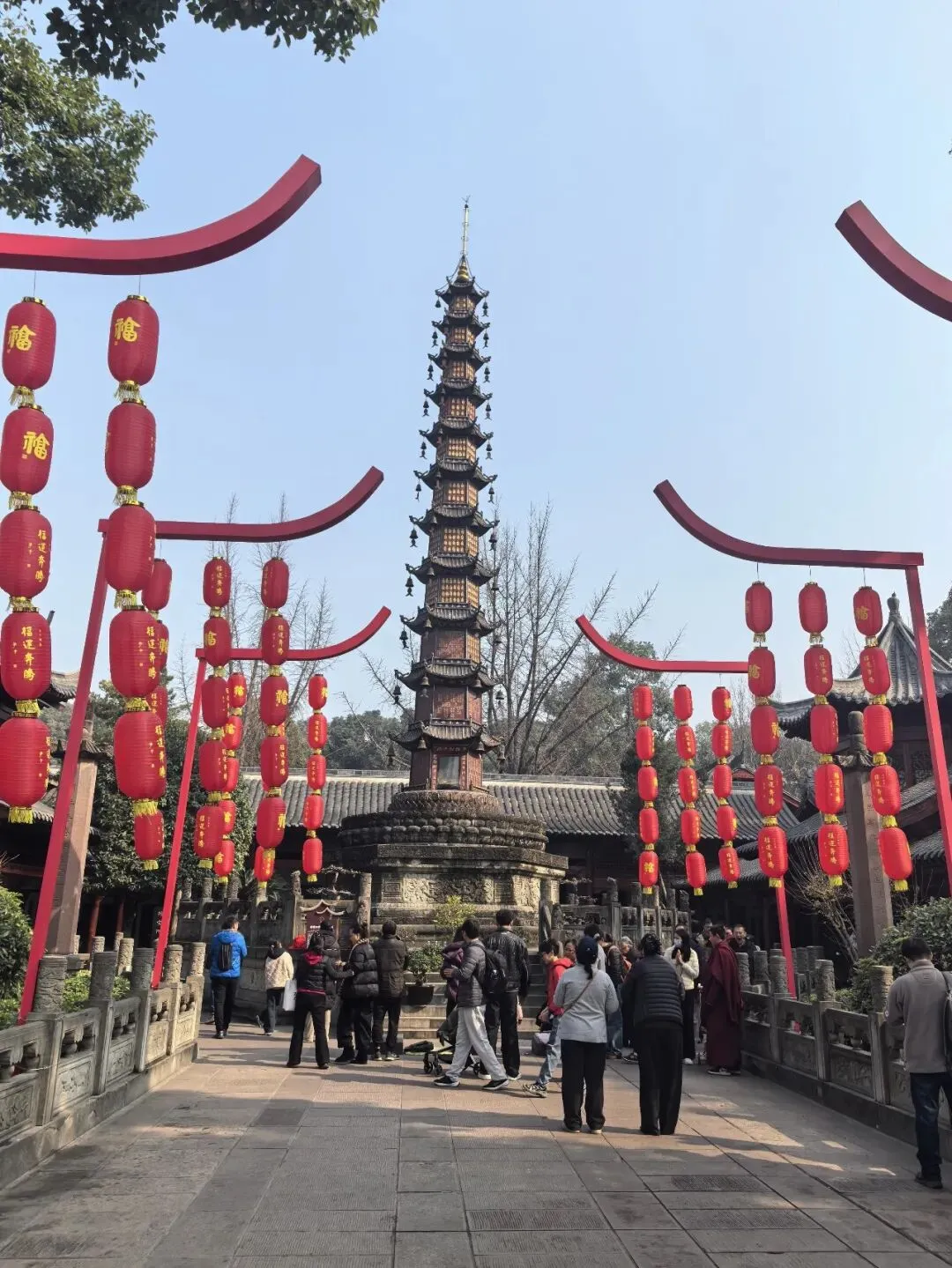 文殊院门口的红墙是网红打卡点,寺院香火旺盛,很多游客和信众都来此祈福。寺院旁边还有一座很高的塔,很多人在此转塔。文殊院门口还有很多特色小吃,价格不贵,味道不错,如果你去成都一定要尝尝。