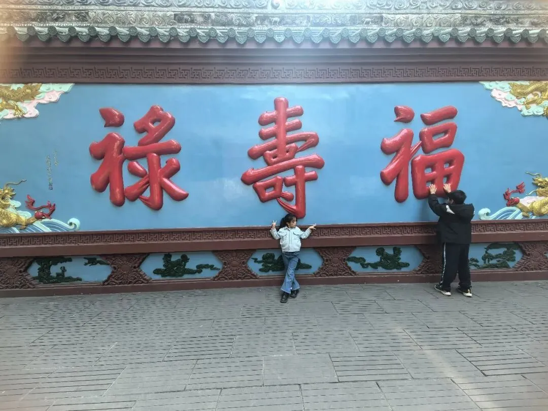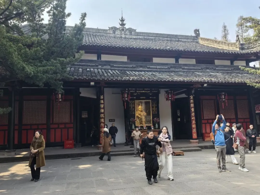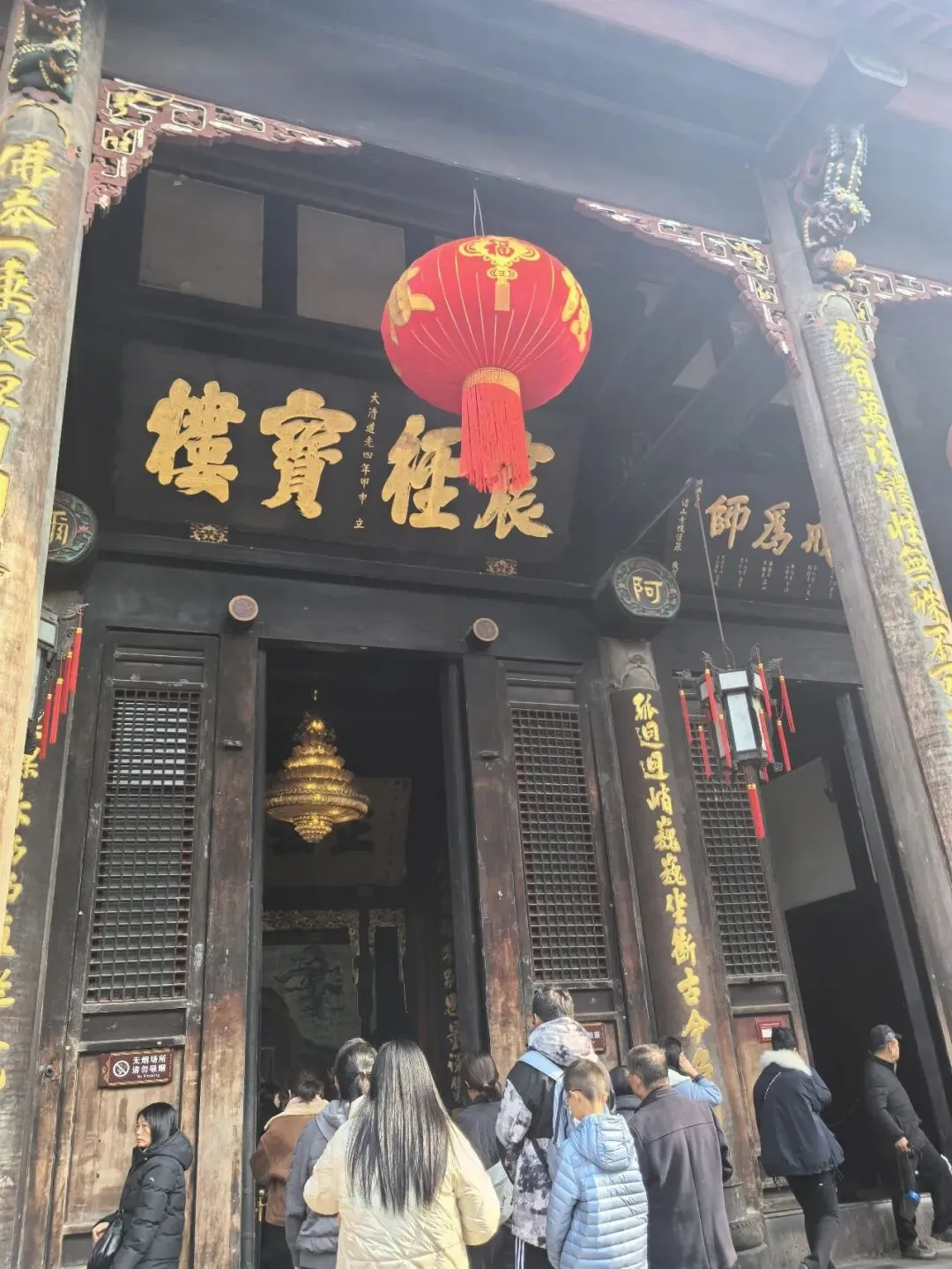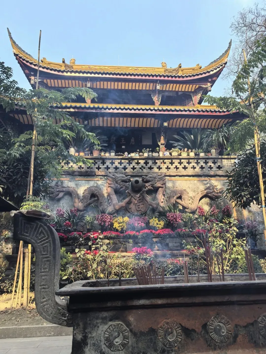 文殊院门口的红墙是网红打卡点,寺院香火旺盛,很多游客和信众都来此祈福。寺院旁边还有一座很高的塔,很多人在此转塔。文殊院门口还有很多特色小吃,价格不贵,味道不错,如果你去成都一定要尝尝。