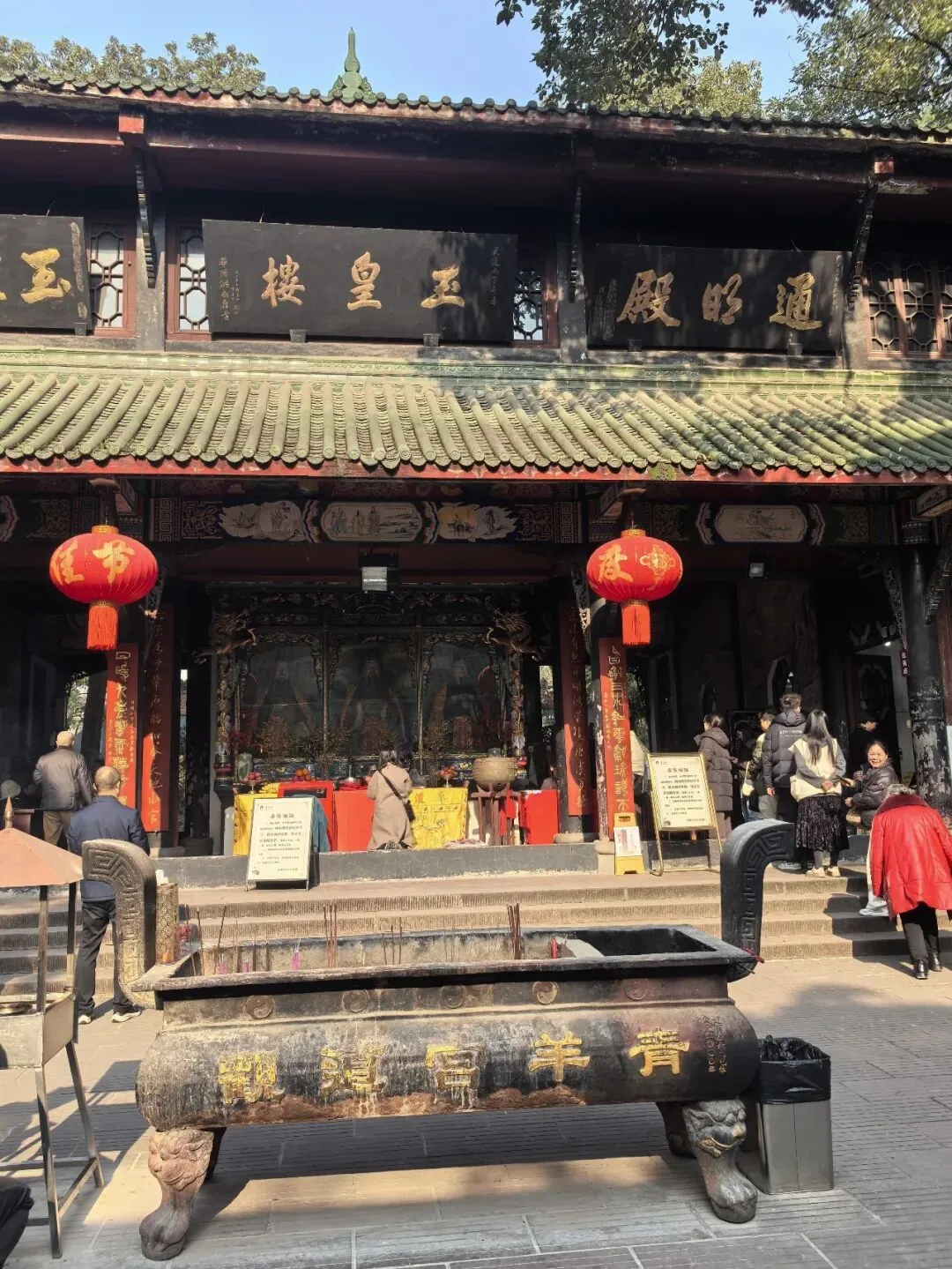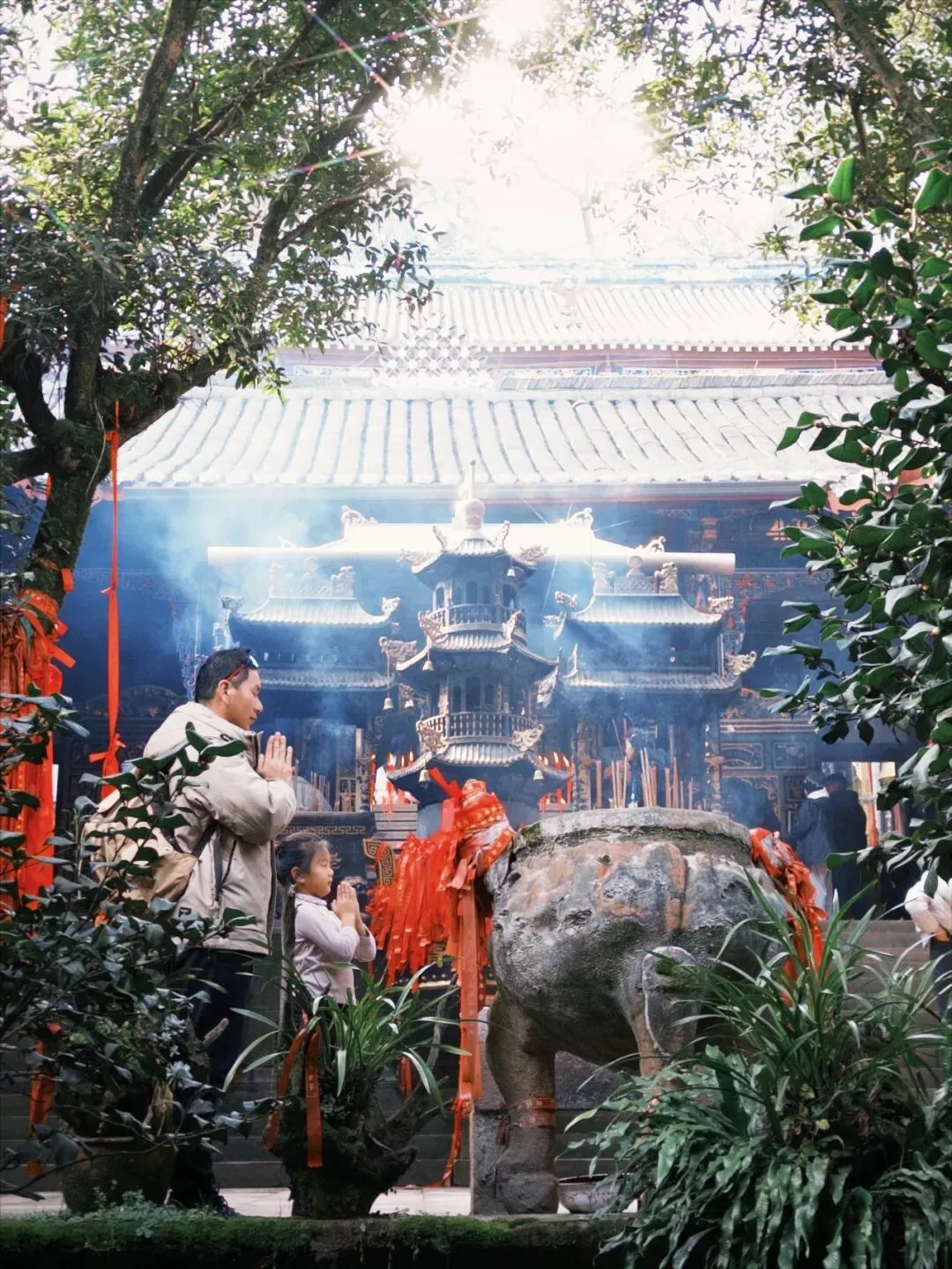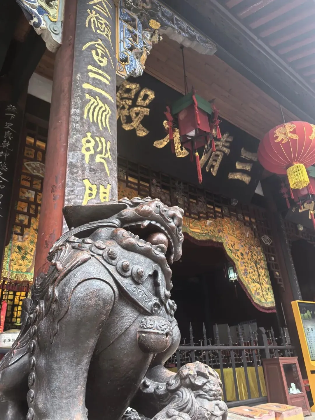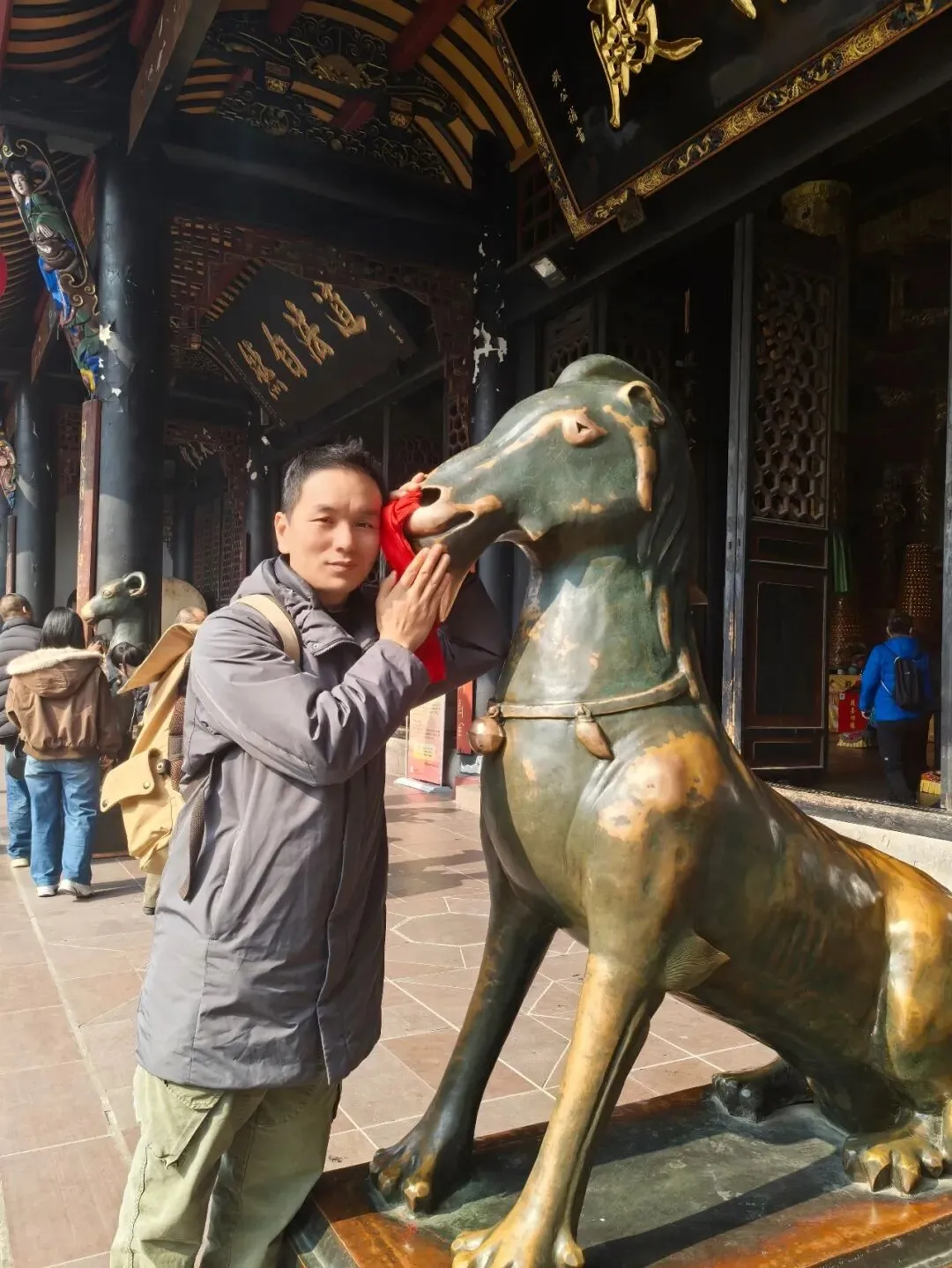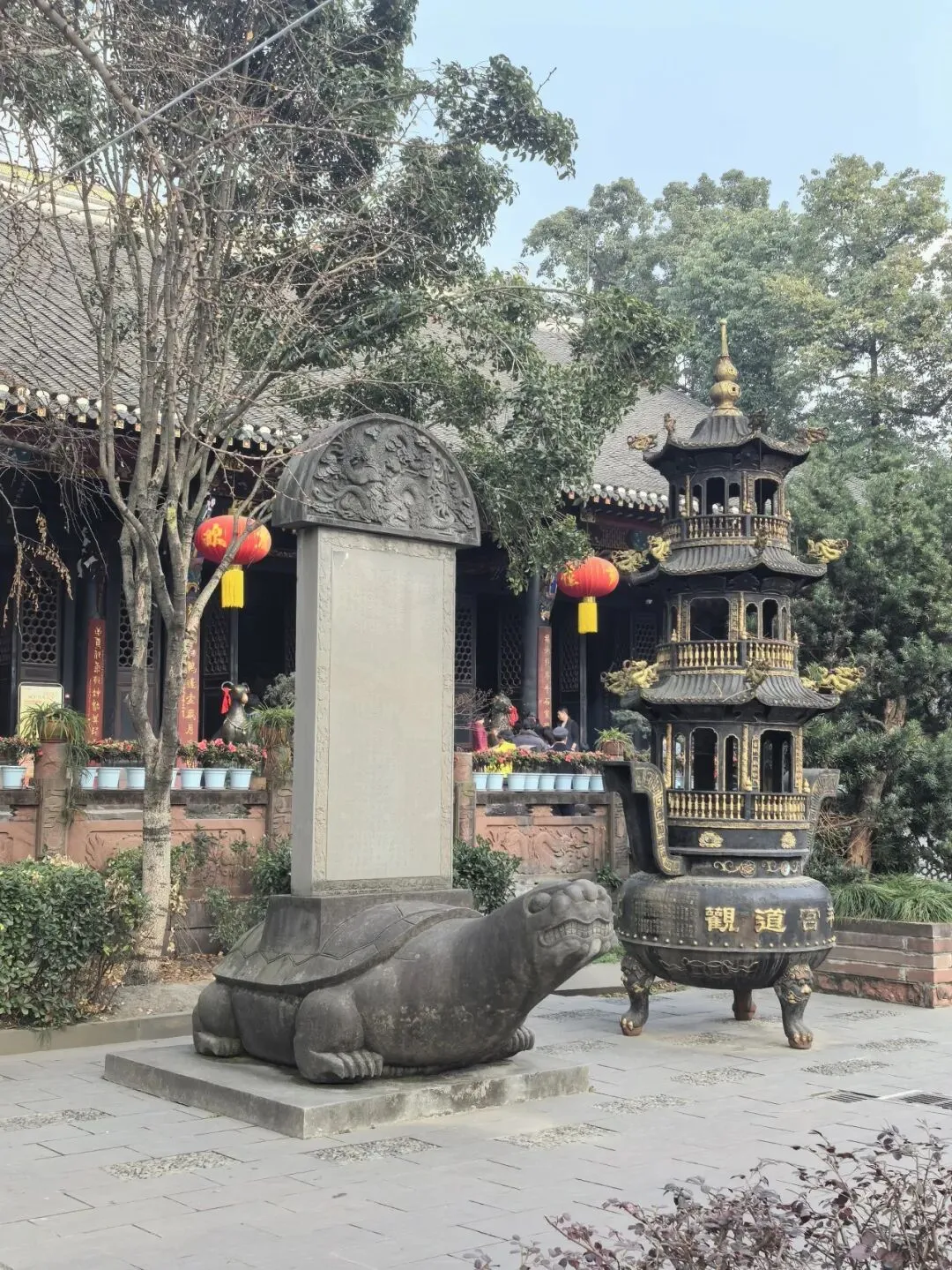 第三个一定看看的就是青羊宫的青羊一定要看一看、摸一摸。青羊宫的独角青羊(单角铜羊)是清雍正元年(1723年)由大学士张鹏翮从北京购得并捐赠给青羊宫的。这只铜羊造型极为独特,融合了十二生肖的特征:鼠耳、牛鼻、虎爪、兔背、龙角、蛇尾、马嘴、羊须、猴颈、鸡眼、狗腹、猪臀。这种将十二生肖元素集于一身的设计,在中国古代艺术和宗教文物中极为罕见,体现了道教文化中“万物一体”“阴阳相生”的哲学思想。