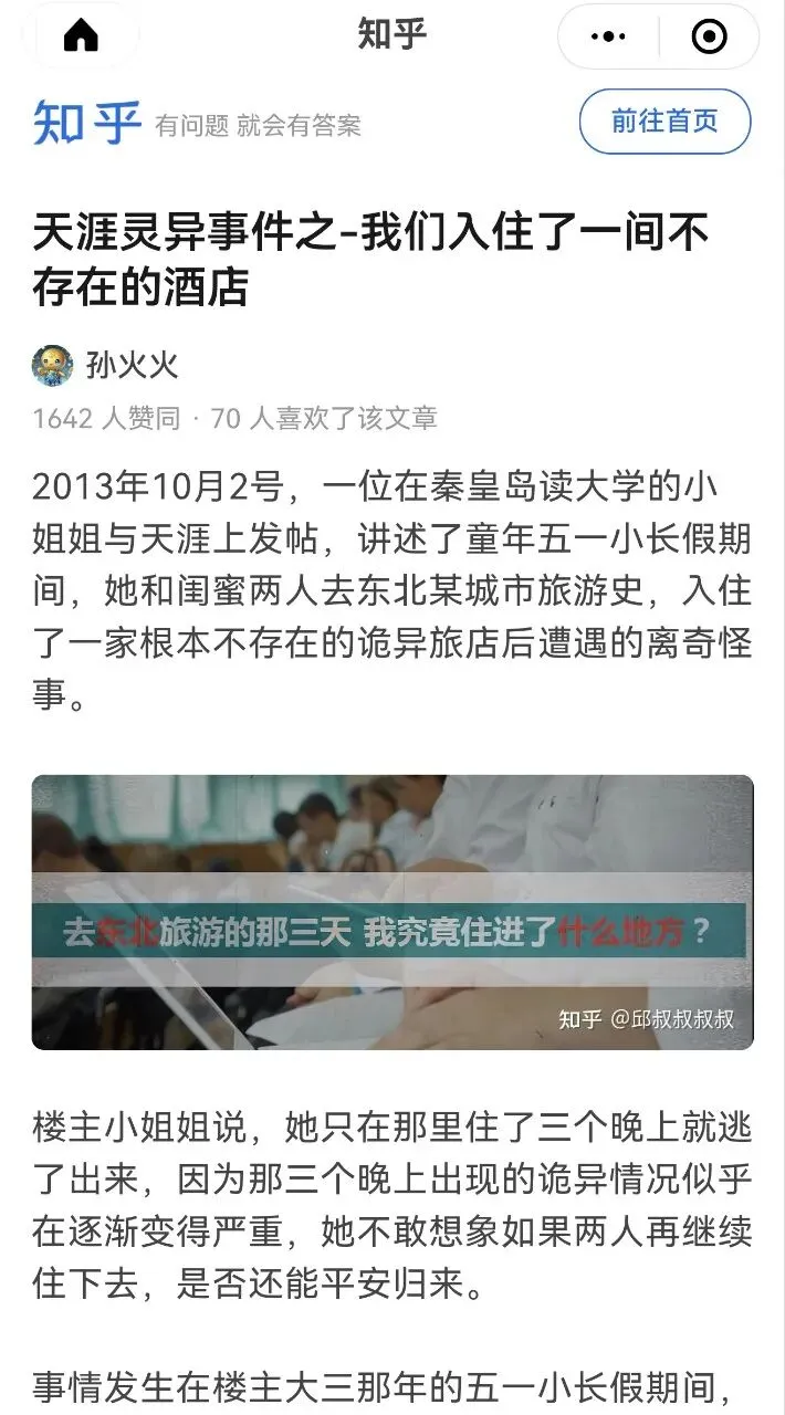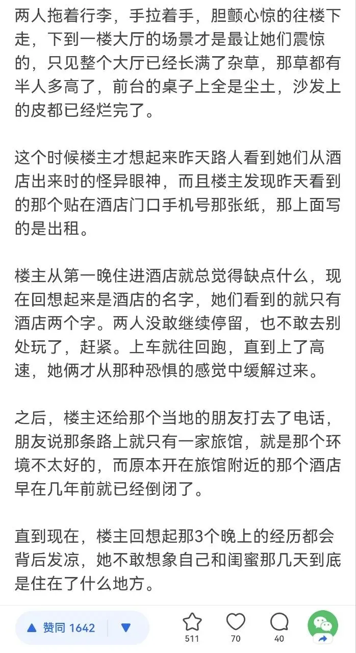 然后最恐怖的是,前两年有南方小土豆去东北旅游,真的入住了废弃酒店。在入住时一切都正常,后来才觉得不对劲。这个太可怕了。
