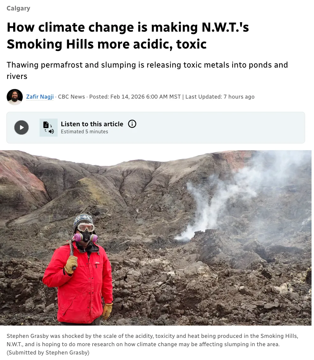 但对卡尔加里研究团队而言,烟山的价值更现实:Smoking Hills是研究永冻层消融如何释放地质源污染物(geogenic contaminants)的“活标本”。