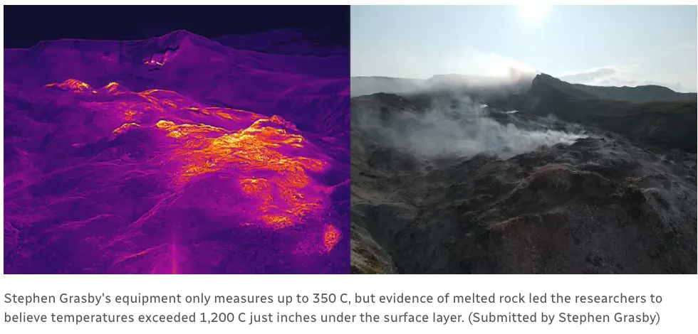 “我们只是出于好奇拍摄热成像,结果发现踩过的地方温度直接爆表。”Grasby说。:"这就像在薄冰上行走,冰下是岩浆。"