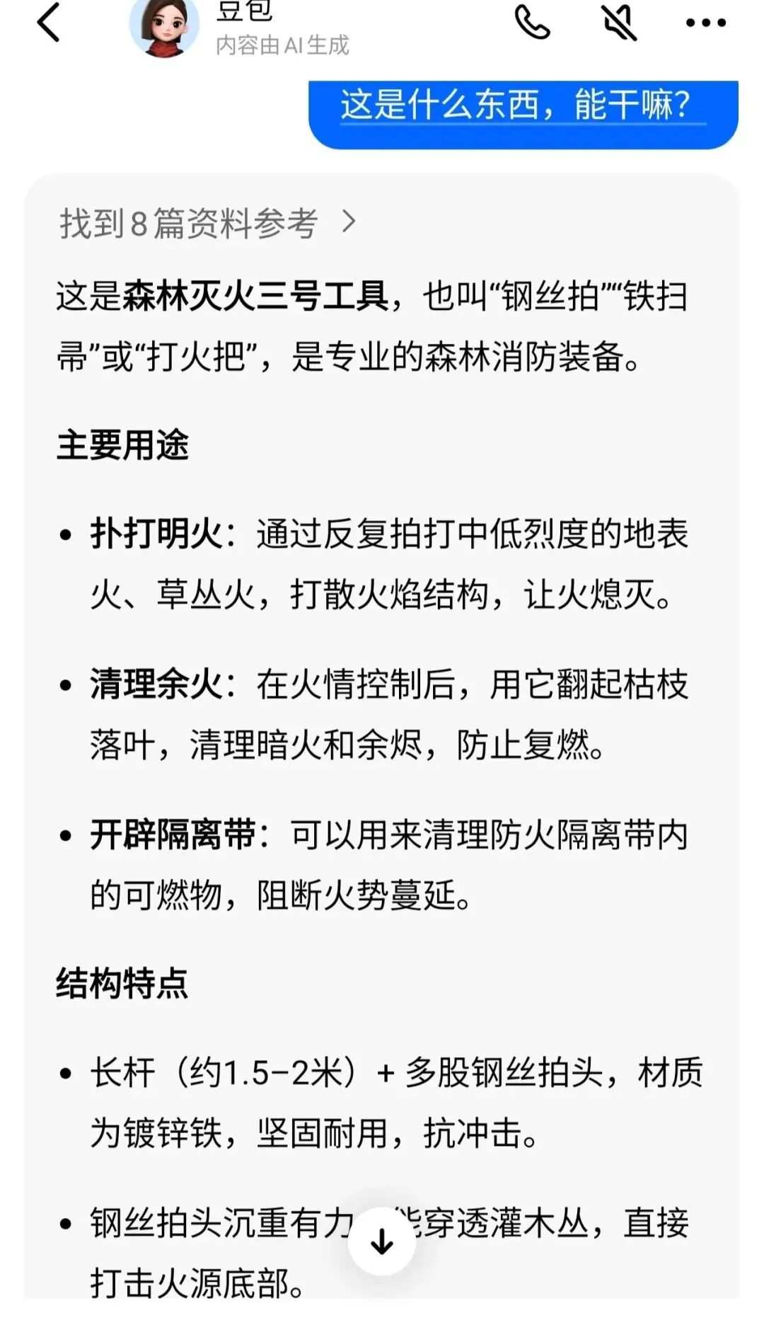 后来我的条友给了答案,豆包说的对,是森林防火工具。她的经历也是多少年不遇一次的惊险刺激,佩服他们的勇气和行为积极参与灭火。普通如我,只爬有卖烤肠的山,估计永远遇不到。