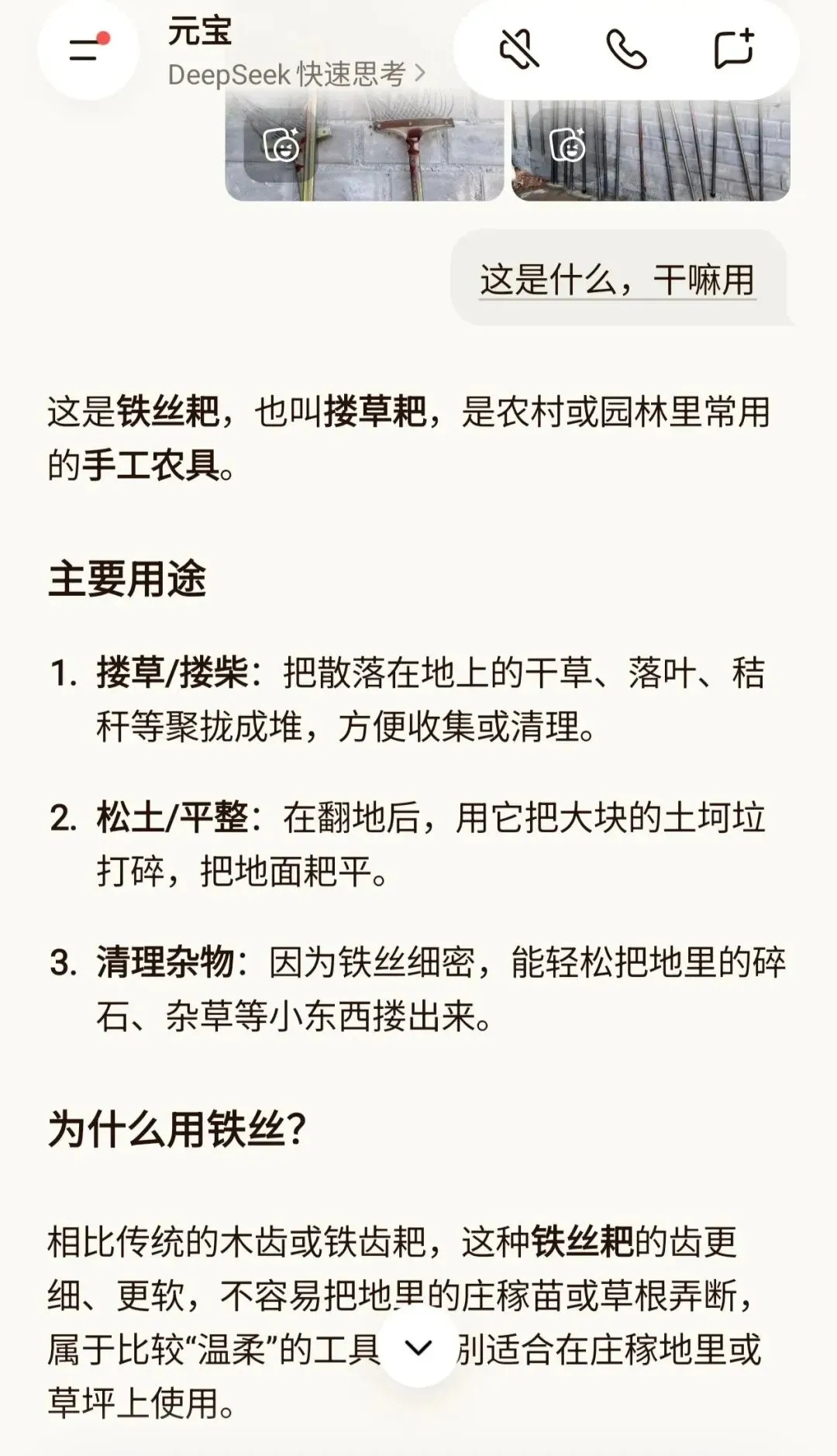 儿子问我这是什么用来干嘛,我也不知道,周围也没有人可询问。刚刚想起问AI,豆包说是森林灭火三号工具铁丝拍、铁扫帚,元宝也说叫铁丝耙,但用途却是普通的农用工具。