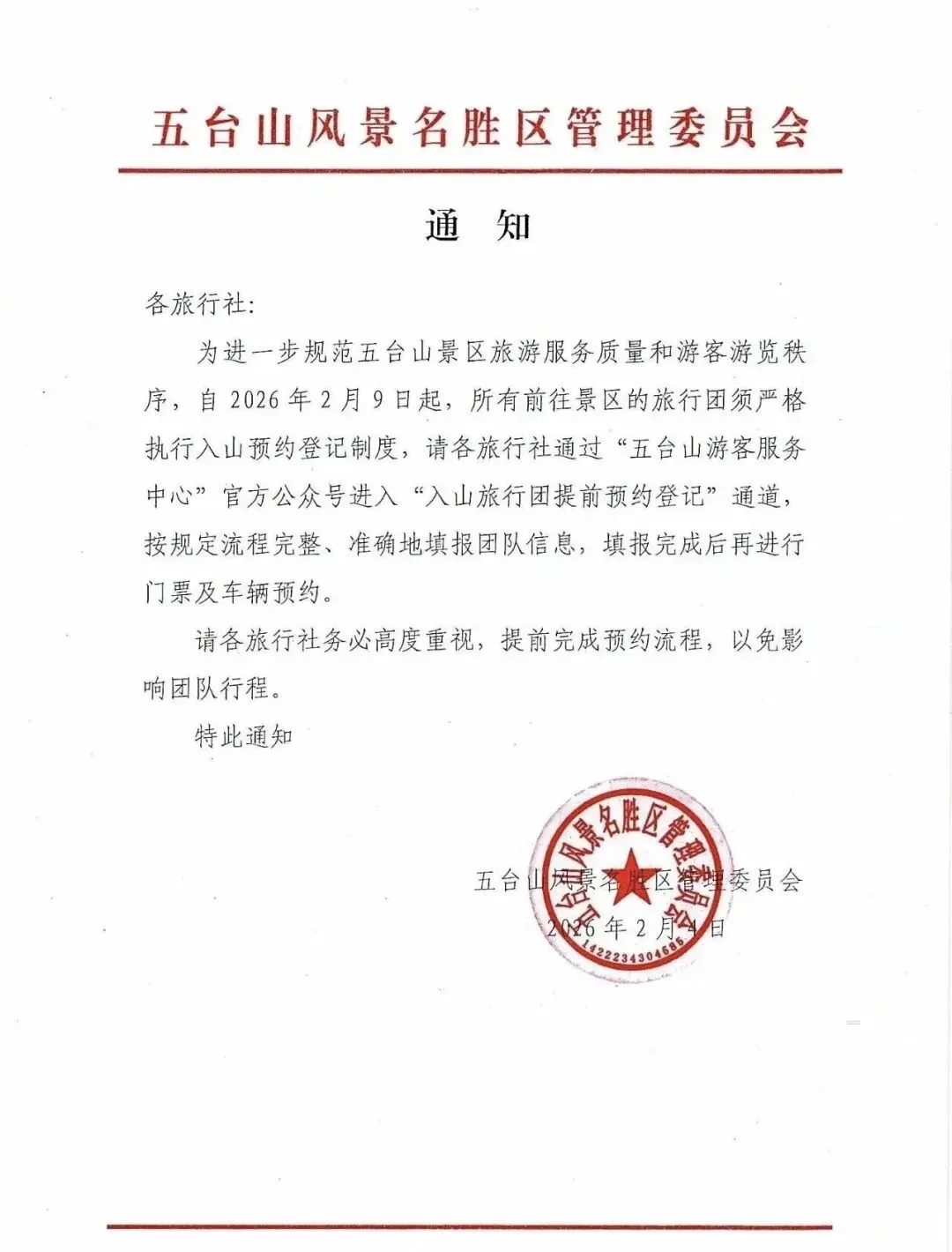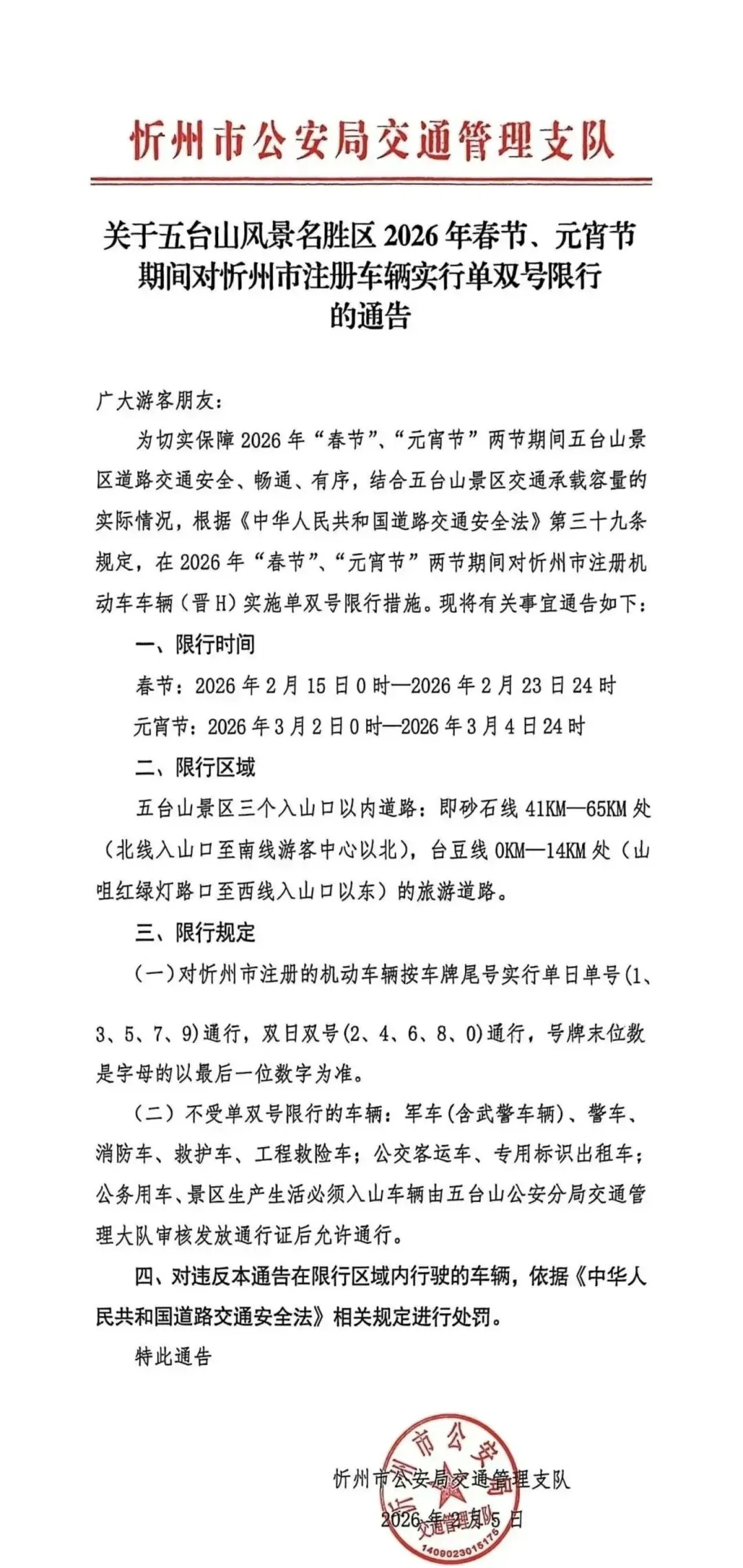 五台山景区对自驾游车辆实行预约制进山政策,每天限定2000辆小型客车可进入景区。五台山游客服务中心服务号是唯一的预约通道,可提前5天(当天和后4天)预约,例如1月1日可预约1月1日-1月5日的车辆。
