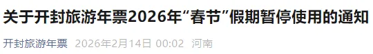 关于开封旅游年票2026年“春节”假期暂停使用的通知