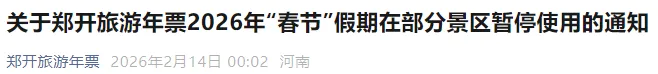 关于郑开旅游年票2026年“春节”假期在部分景区暂停使用的通知