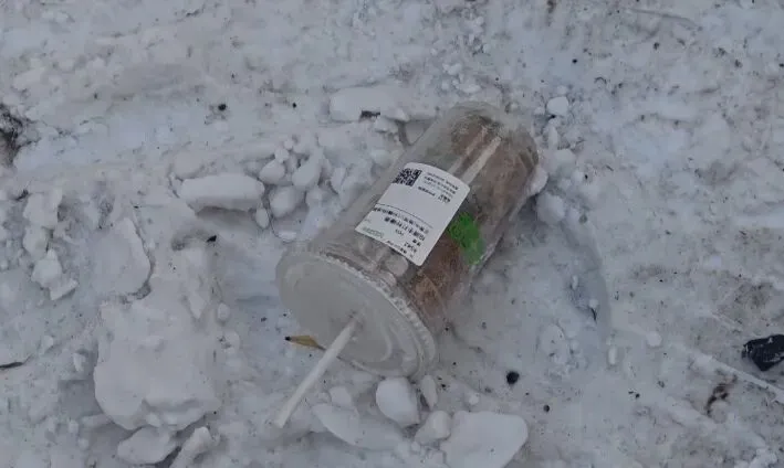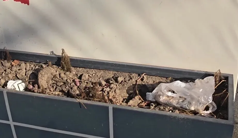 在纬二路与晚报大街路牌处附近,垃圾袋、奶茶杯等垃圾被随意丢弃。