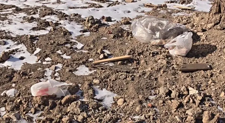 在北二路大庆的牌子下,有被随意丢弃的垃圾袋。