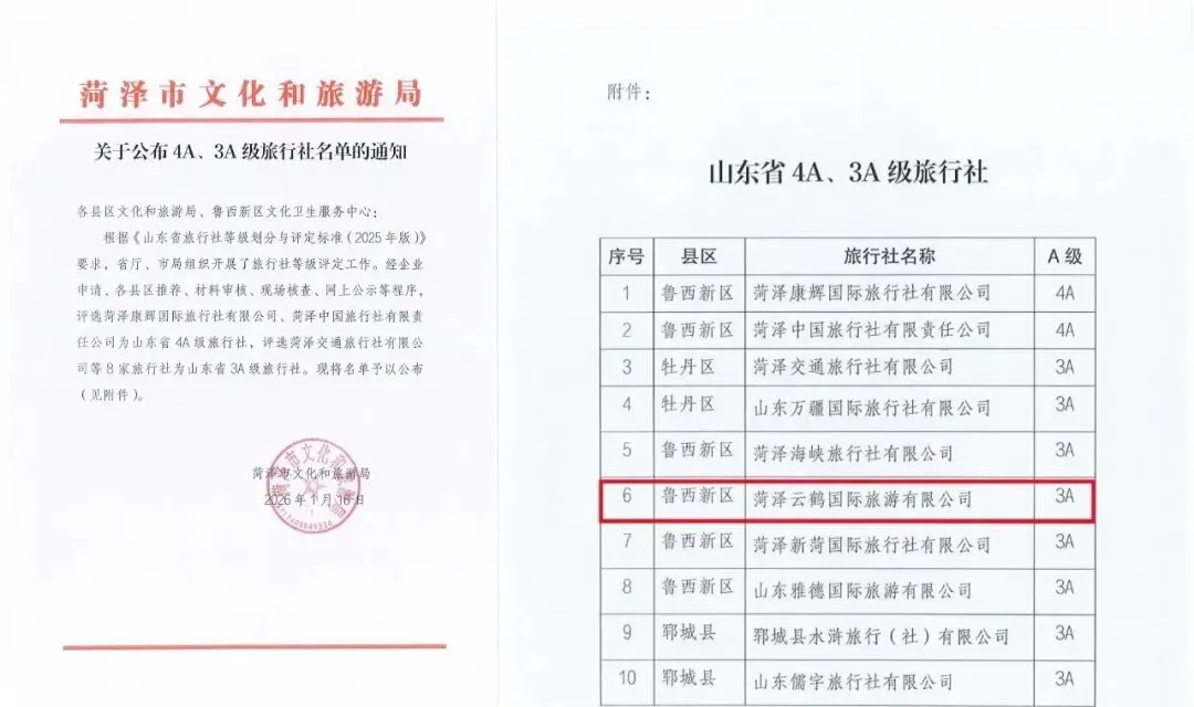 近日,经山东省文化和旅游厅、菏泽市文化和旅游局统筹组织评审,文旅集团云鹤国际旅游有限公司(以下简称“云鹤旅游”)凭借扎实的综合实力与优质的服务水平,顺利通过全流程规范评审,成功获评“山东省3A级旅行社”荣誉称号。
