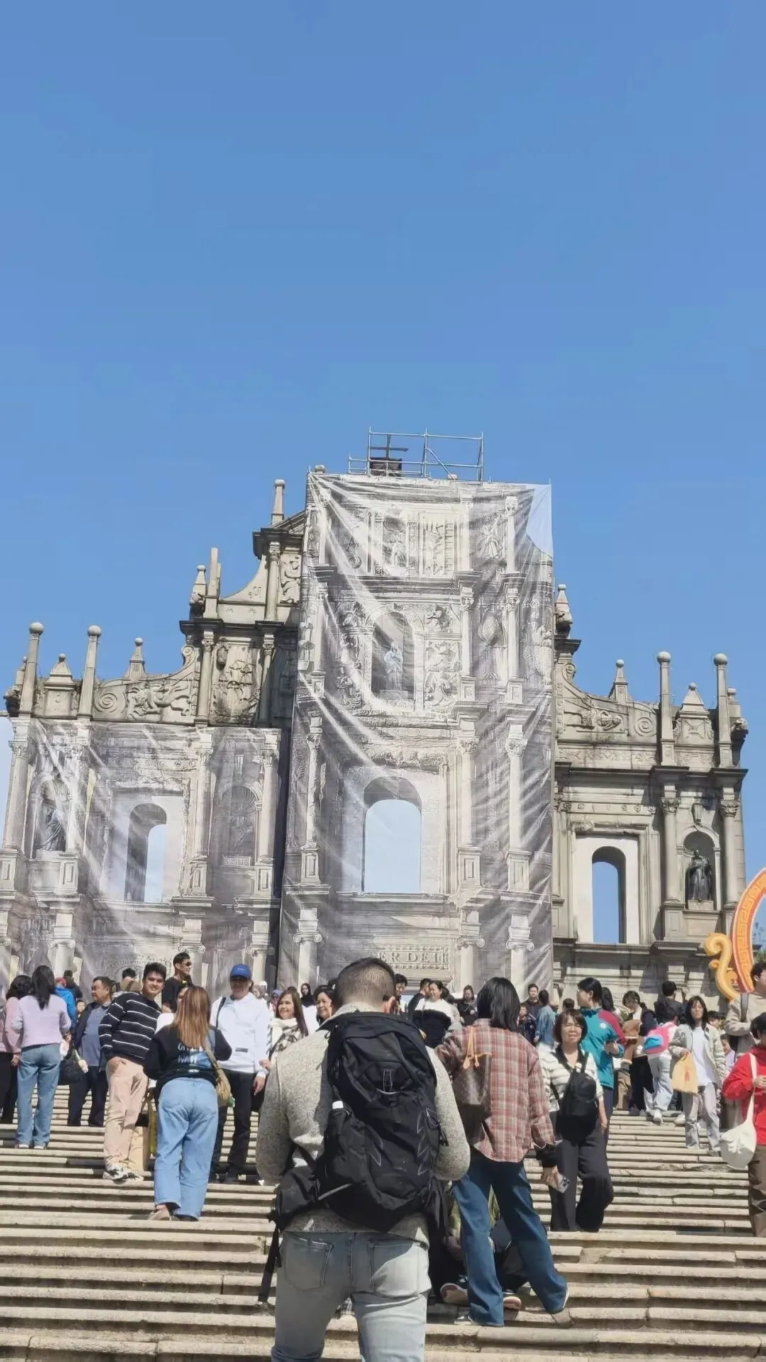 一路上拍照打卡的人很多,一路往上走一路拍。等到了近处才发现大三巴牌坊的壁上悬挂着与墙壁颜色相近、画面正好与其他地方形状相对接的围布,而围布里面就是维修维护的区域。