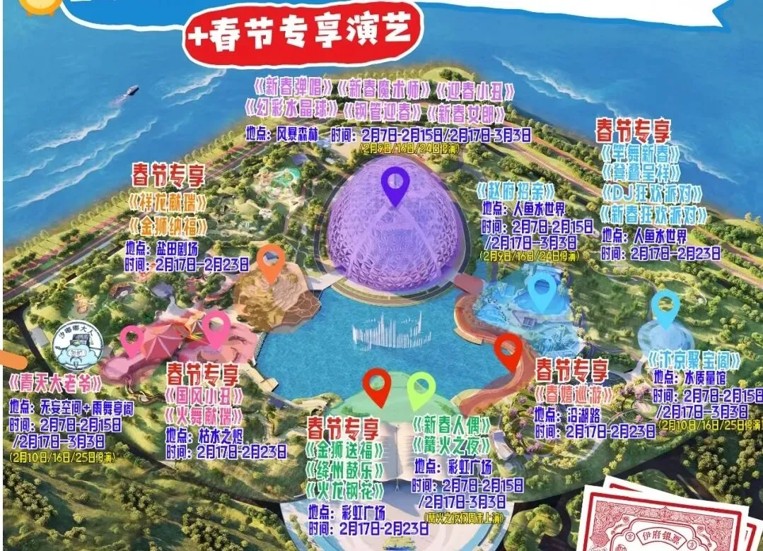 活动内容:在街区开展“山海万象”市集、不倒翁、美人鱼表演、马年主题NPC游戏、街区巡游、迎春祈福、山海花灯等特色活动;购票畅游大型神话演出《神火纪元》、国际大马戏、萌宠乐园、游乐场等。