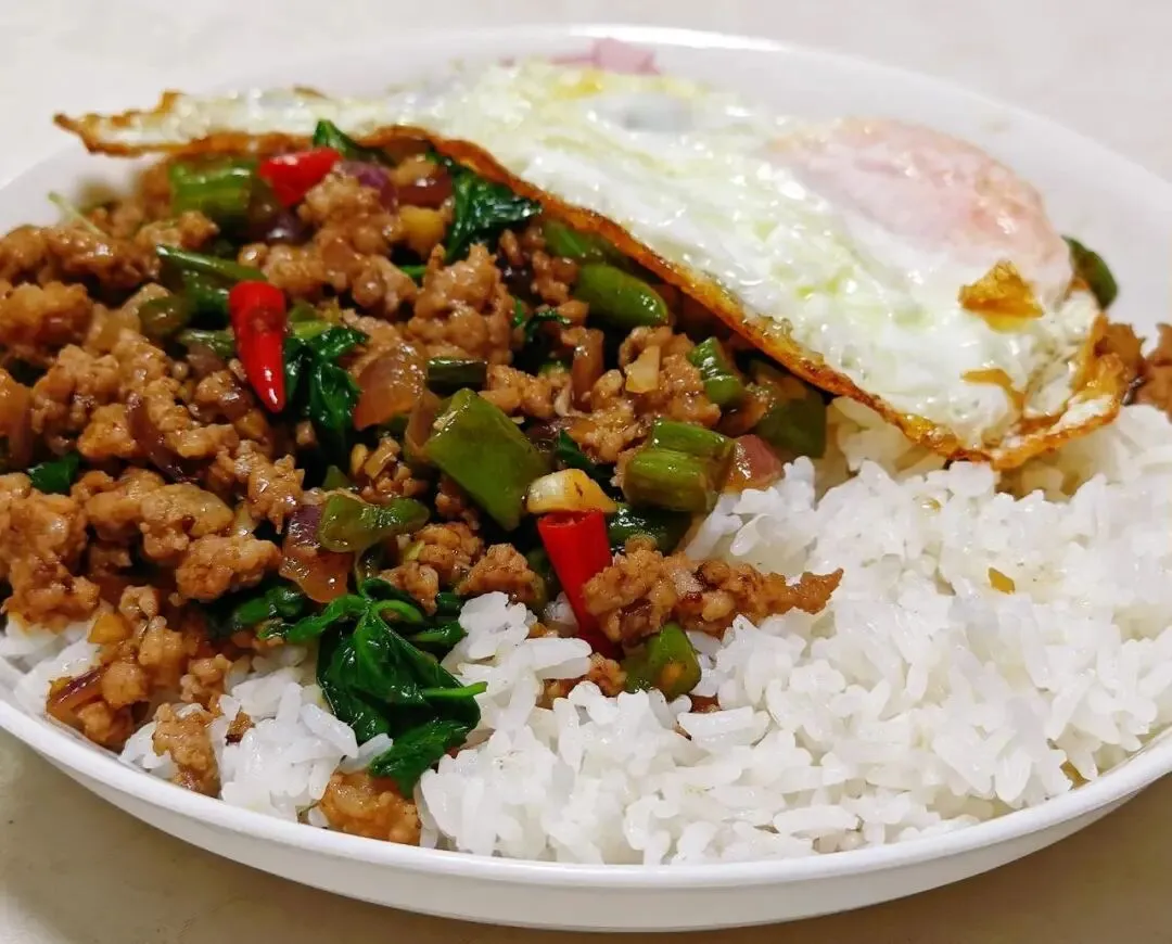 打抛叶(圣罗勒)的独特香气是这道菜的灵魂。将绞肉与蒜、辣椒快炒,加入打抛叶爆香,铺在热腾腾的白饭上,再盖一颗半熟煎蛋——简单却超有满足感。别担心,在曼谷多数摊位都会做“游客友好版”,不会太辣。