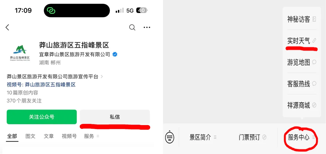 想了解景区春节天气的游客朋友,可以微信关注“莽山旅游区五指峰景区”微信公众号,点击:私信-服务中心-实时天气”,即可查看莽山五指峰实时天气。
