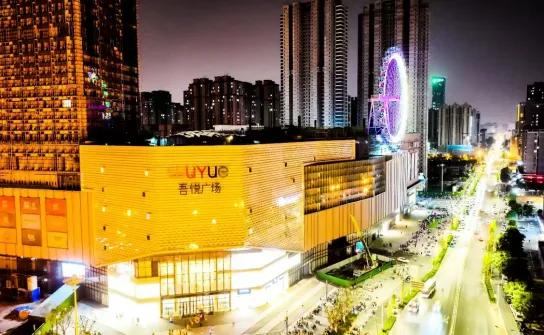 太原吾悦广场:总建筑面积52万㎡,包含购物中心、金街、写字楼,其中购物中心建筑面积14万㎡,金街2万㎡,作为山西首座摩天轮购物中心,邀请国际知名设计公司伍兹贝格和澳洲凯里森主案设计,探索建筑的当代时尚质感,打造简约而有品质,时尚而又持久的城市商业新标杆。广场星光摩天轮坐落于吾悦广场屋顶,总高103 米,是山西首座屋顶高空摩天轮。摩天轮配备 28 个主题轿厢,旋转一周约 13 分 14 秒,夜间灯光绚丽,可俯瞰汾河与城市全景,是太原城西标志性文旅打卡地。