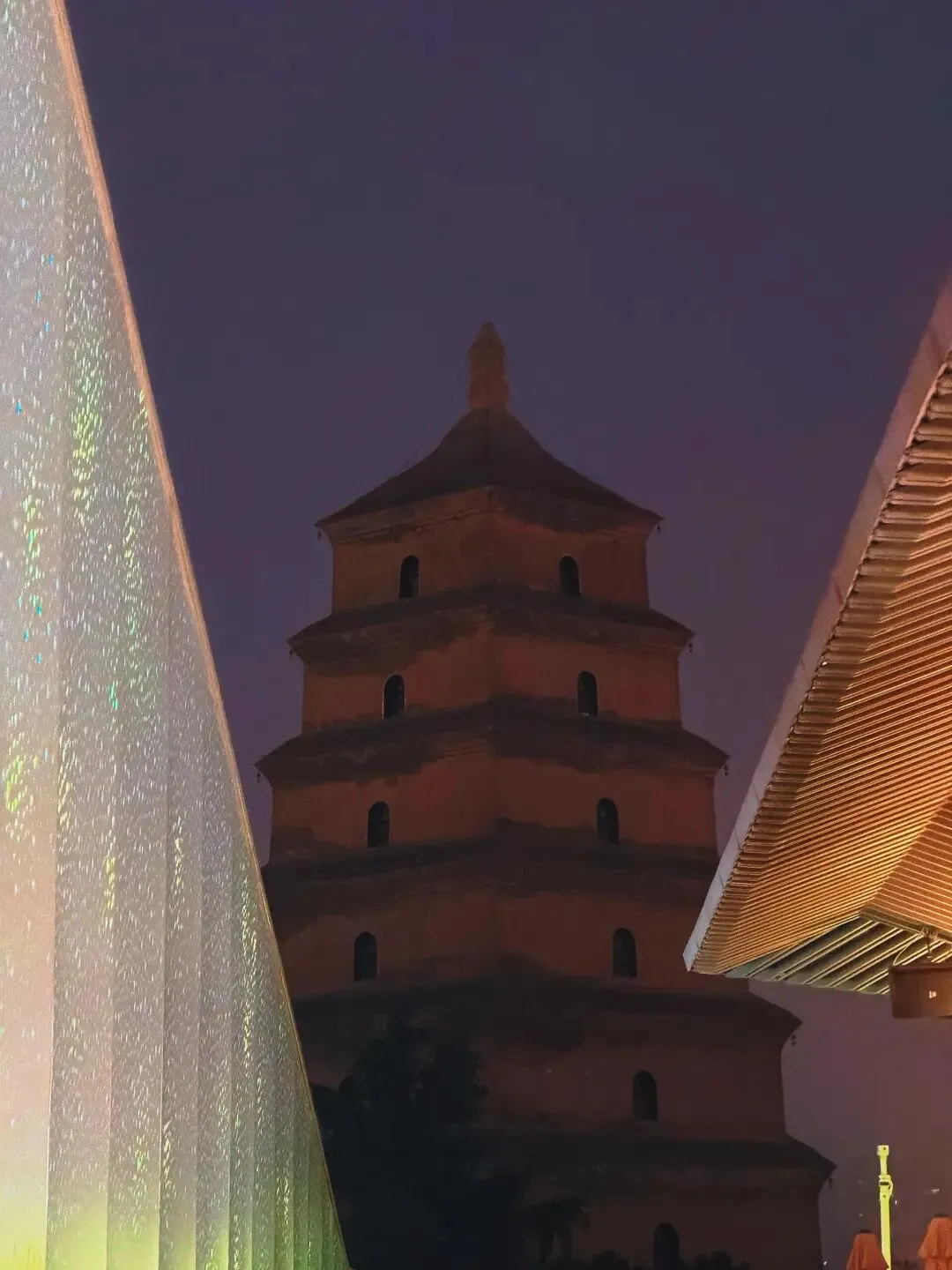 晚上的重头戏是大雁塔和大唐不夜城!穿过南广场的玄奘铜像,一脚踏进1.2公里的灯火长街,璀璨的灯光把整条街点亮,氛围感直接封神,边走边逛,仿佛闯进了盛唐的夜宴!
