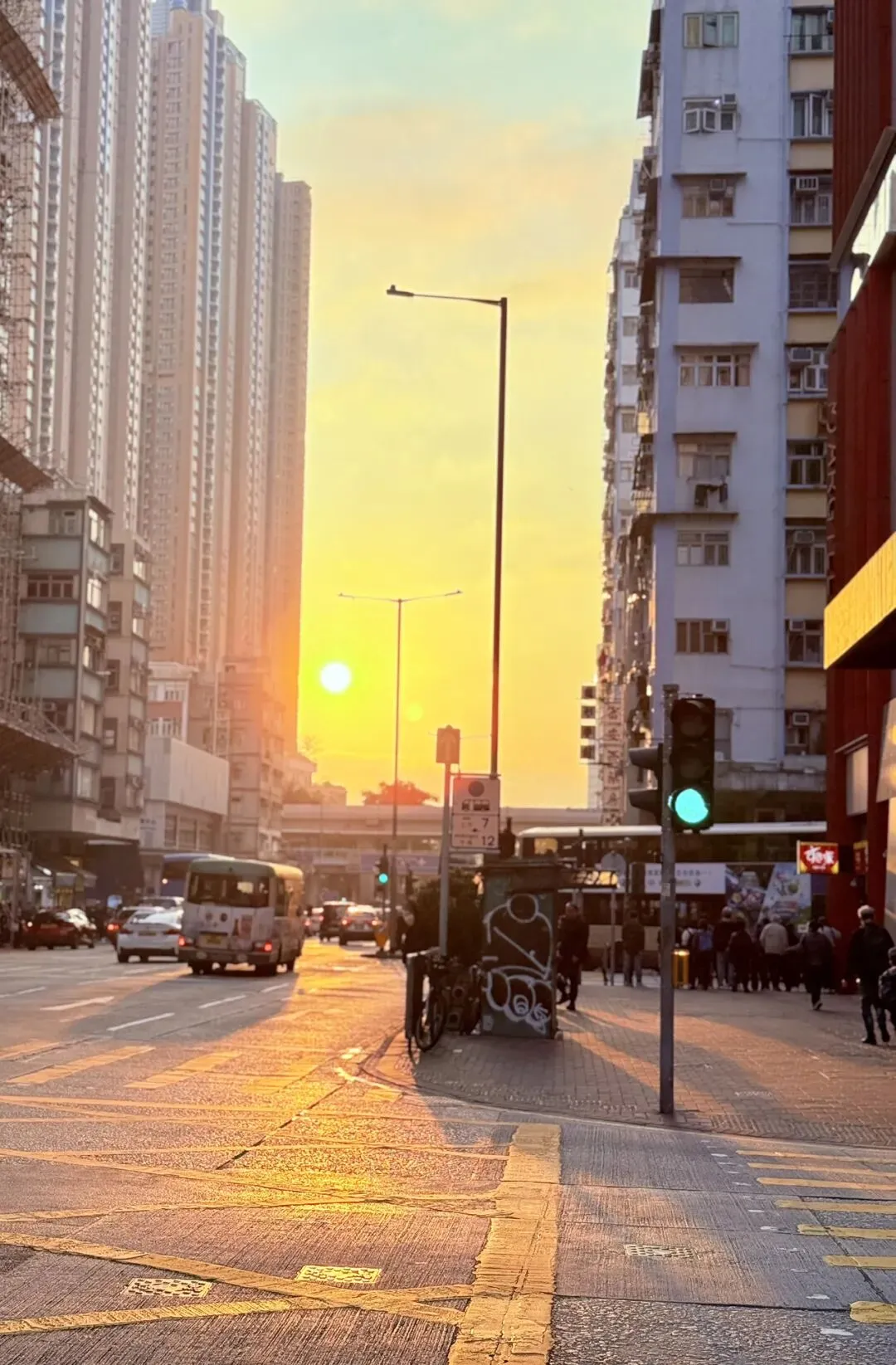 楼房又高又旧,街边店铺贴满密密麻麻的招牌,夕阳从高楼缝隙洒下来,照在行人与车辆上,格外有氛围感。