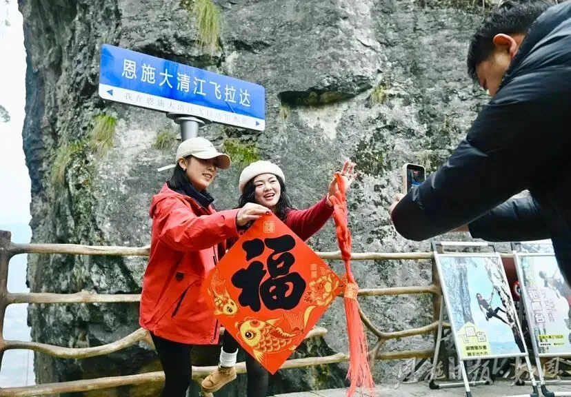 乘画舫,在蝴蝶崖前许愿;登峰林,在丹霞绝壁上接福;吃年饭,35元升级土家团圆桌餐。