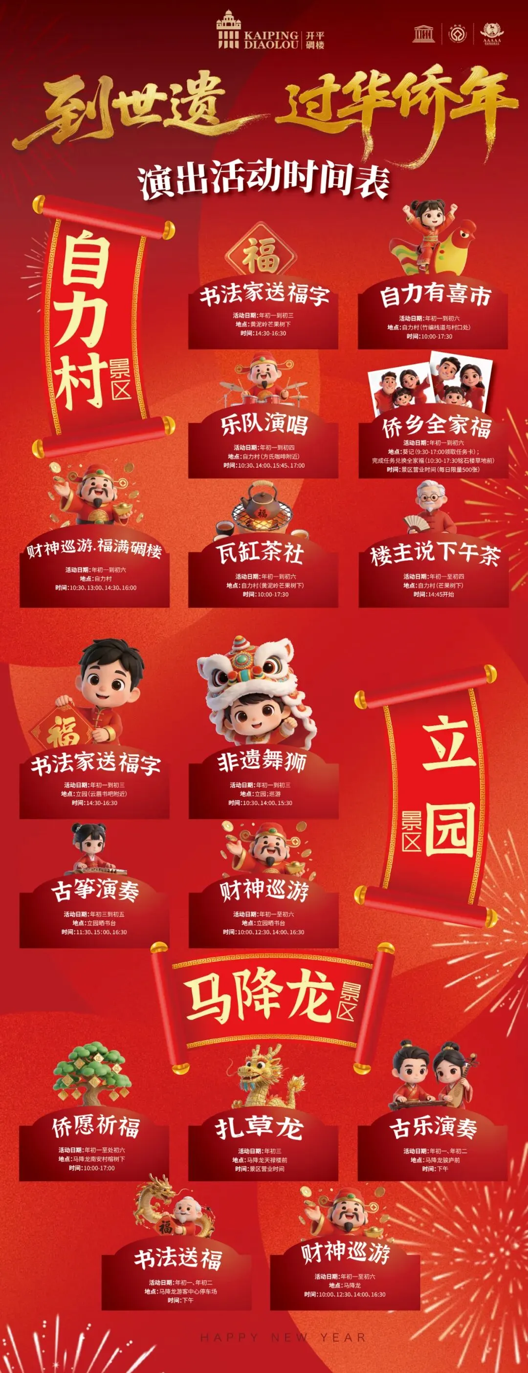 2026年,马年新春。开平碉楼与村落,这座被时光温柔抚摸的世界文化遗产,正缓缓展开一幅属于华侨的独特年景画卷。大年初一到初六,一连串精彩演出活动即将上演,带你沉浸于华侨文化的温暖氛围之中。