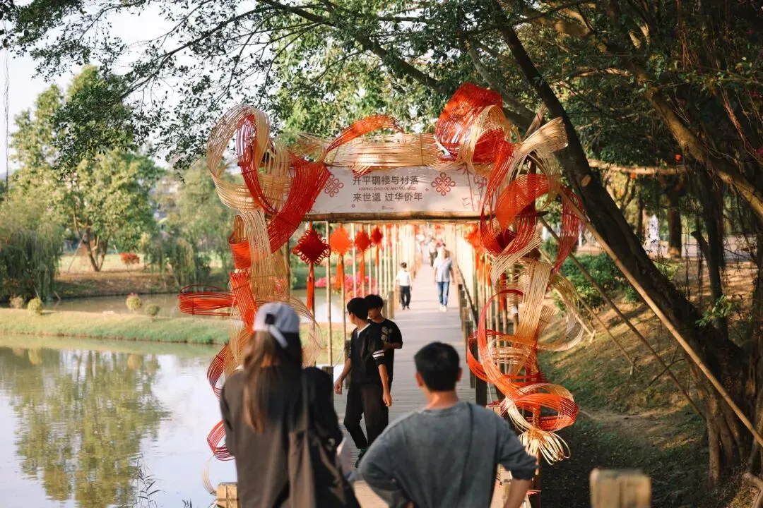 入园即见惊喜。以翠竹编织的巨幅中国结,悬挂于立园牌坊之间,东方意蕴与自然材质交融,成为最别致的迎客礼。亭台楼阁也早已换上“新年盛装”,处处点缀着侨乡特有的喜庆元素。