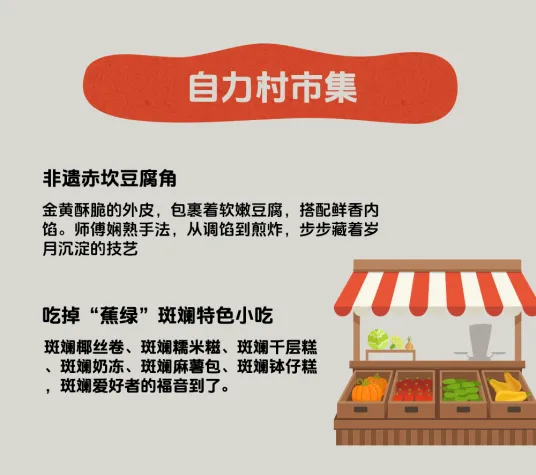 “自力有喜市”市集里的非遗赤坎豆腐角、椰香浓郁的斑斓糕点、历史悠久的驸马棕和暖心黑醋猪脚姜,让你边吃边听故事,把开平的味道带回家。