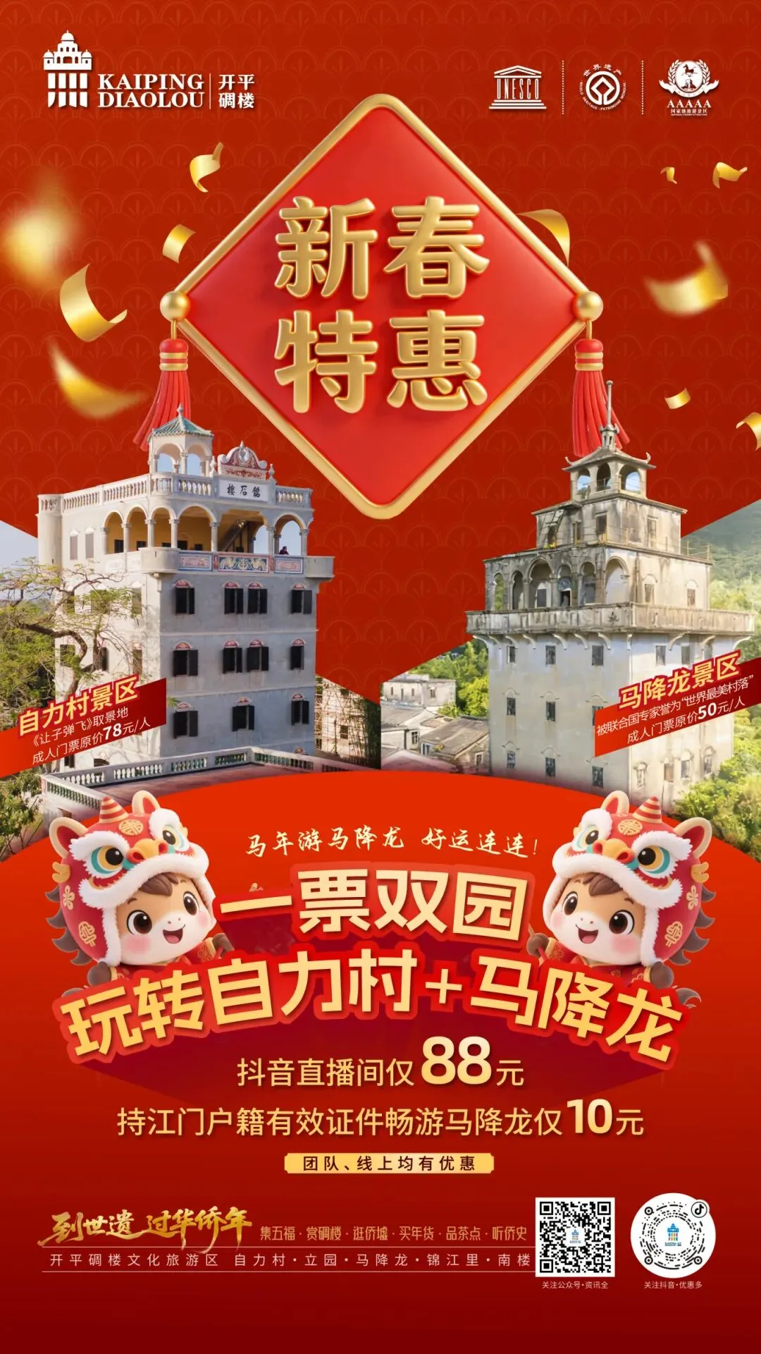 为让这份团圆的温暖更可亲近,开平碉楼文化旅游区特别推出新春票务优惠: