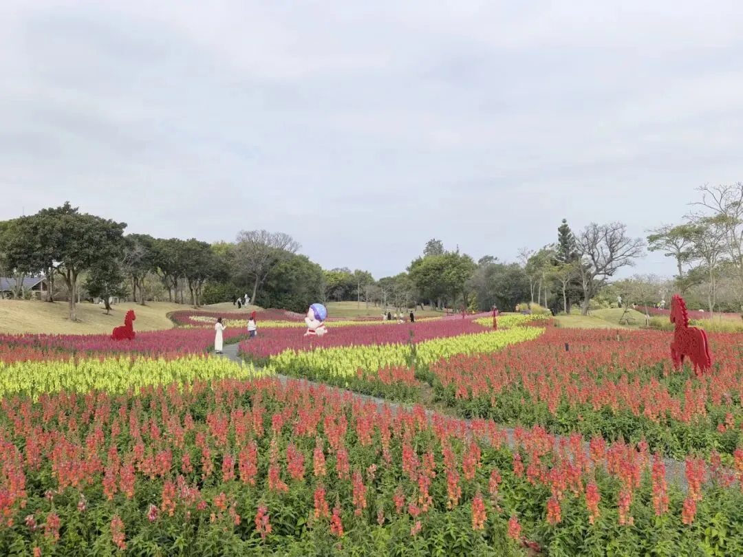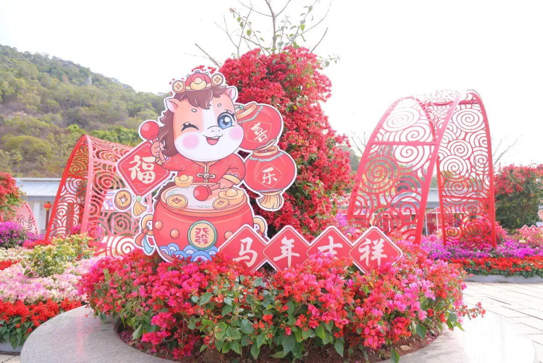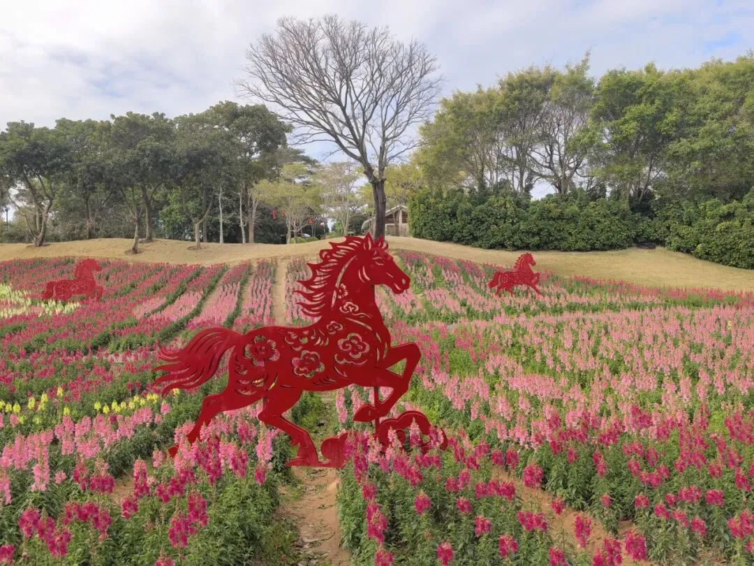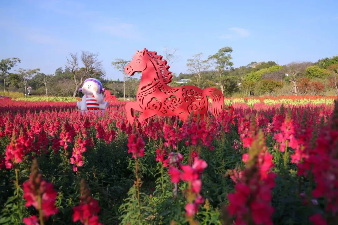 在植物园狮山园里,16万株金鱼草铺成6000平米花海,满眼吉祥喜庆;赤色“剪纸马”跃立于花海之上,“旺”马奔腾,喜上眉梢。