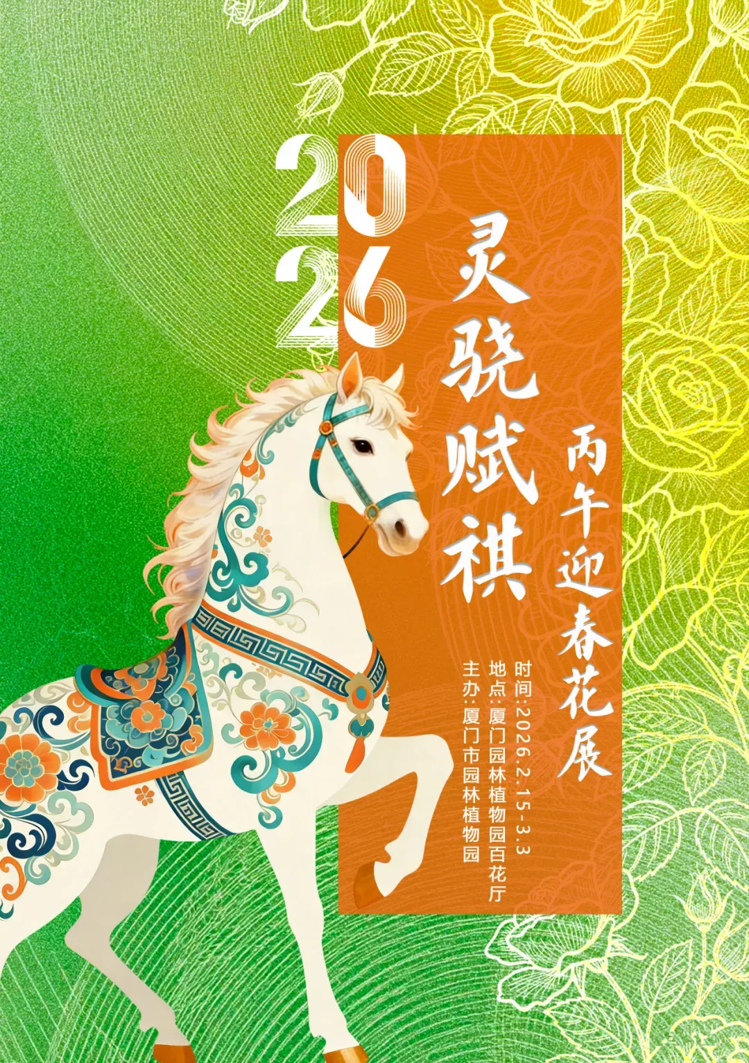 2026年2月15日至3月3日,“灵骁赋祺”丙午迎春花展在植物园百花厅举办。