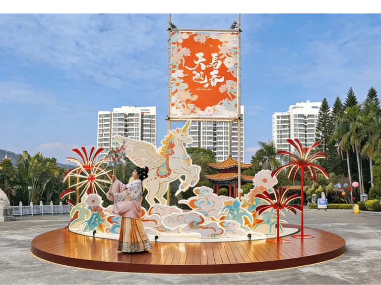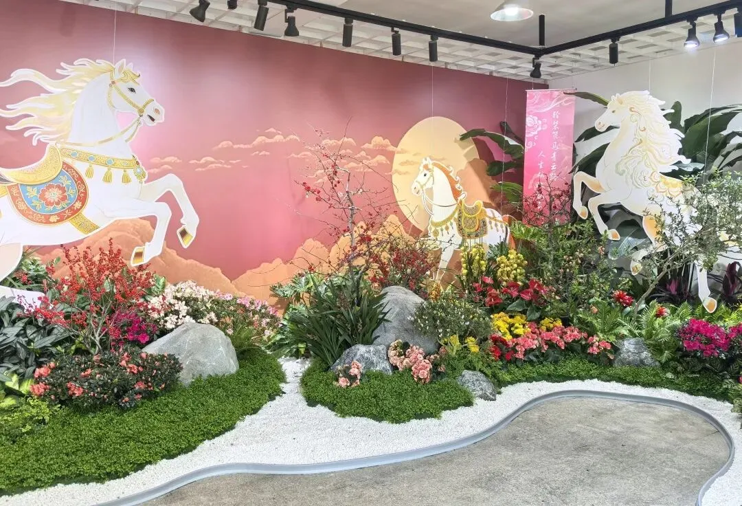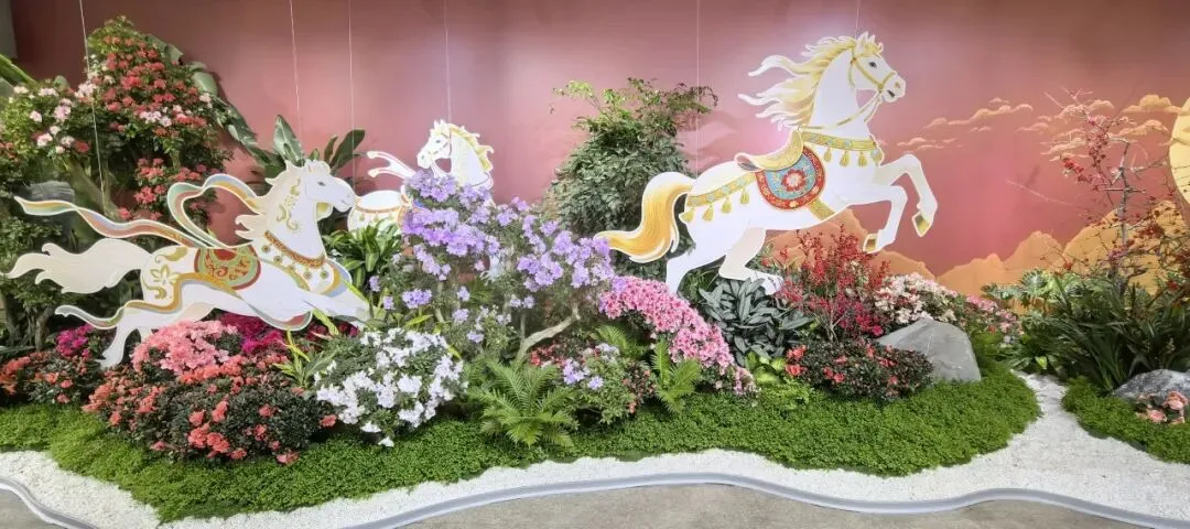 灿烂的春日盛景,在这里以现代景观艺术手法演绎,绿植造景结合软装小品,“骏彩繁花”“云驰丹华”“喜从天降”“骐骥探春”“赤马迎春”“花马贺岁”六大主题六个展馆,组成一场视觉盛宴,诗句中的美好场景,跃然眼前。