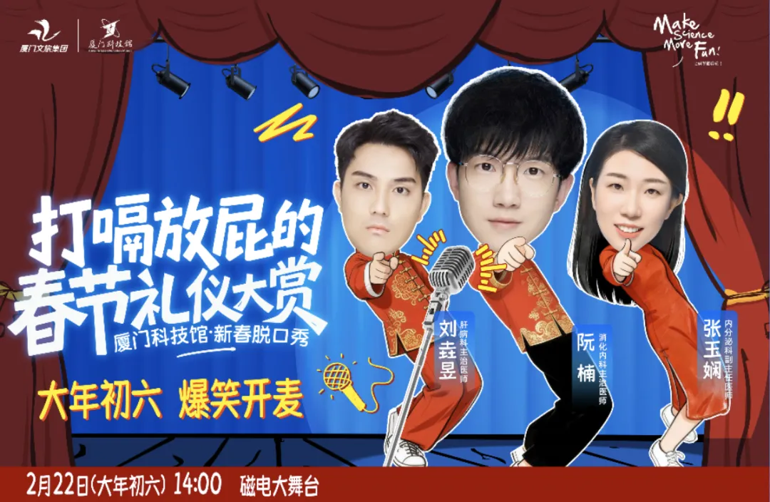 三位医生,一场脱口秀正经科普,不正经开讲,你闻过屁的隐藏款吗?为什么一紧张就想上厕所?大年初六来厦门科技馆看《健康才是头等大事》新春脱口秀,把气顺一顺,和气生财