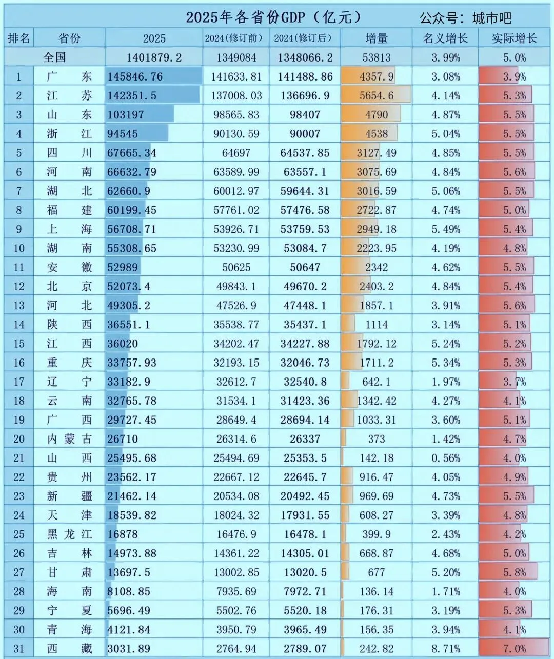 截至目前,全国31省份GDP已全部出炉!从经济总量上看,广东、江苏、山东、浙江、四川、河南、湖北、福建、上海、湖南位列前十。从经济增速上看,18个省份跑赢全国5%的大盘,西藏以7%的增速领跑。2025年各省份GDP排名与2024年变化不大,重庆GDP总量超越辽宁,排名上升1位。31省份GDP总量排名依次是:↓