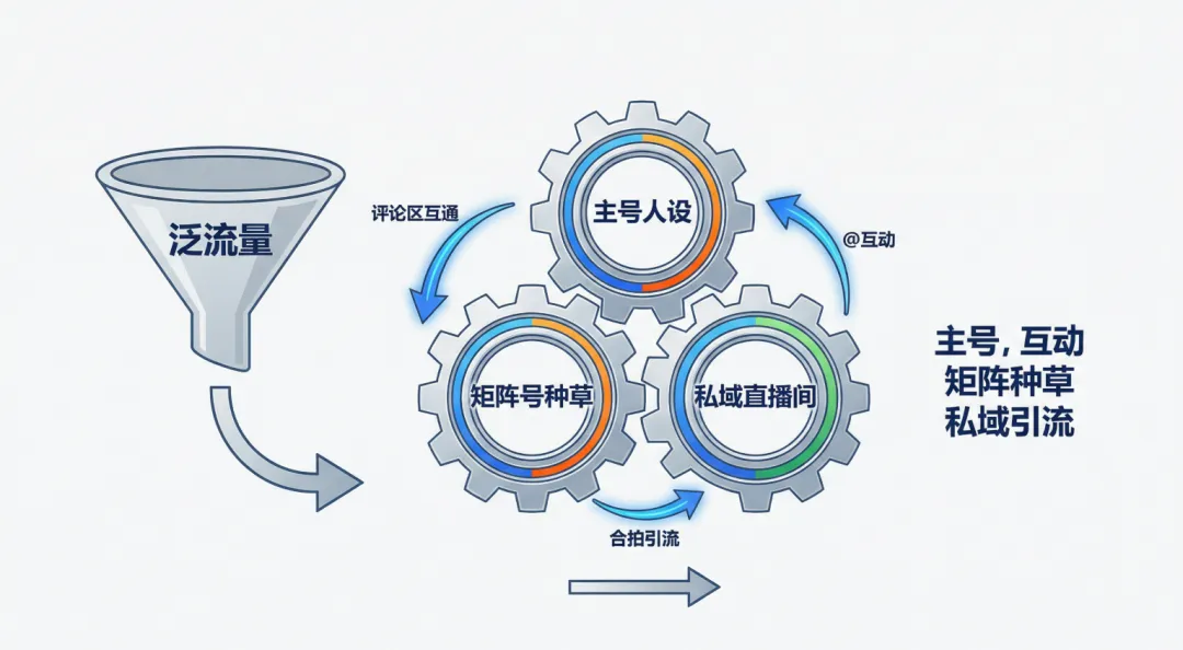 我的建议是 1+3 配比 : 1艘航母(主账号) 定位:打造超级IP。比如“背包客老罗”、“高端游老刘” 任务:建立信任。让粉丝觉得你是个活生生的人,有品位、有脾气 内容:50%价值观输出+30%旅途Vlog+20%高端生活方式 切记:尽量少挂小黄车,少接烂广告。这是你的脸面 3艘护卫舰(矩阵号) 护卫舰A(测评号):专门做酒店民宿测评。极度垂直,只拍房间好不好、早餐好不好吃 护卫舰B(攻略号):专门做当地美食攻略。比如“吃遍成都”,抓搜索流量 护卫舰C(变现号):专门做直播特价切片。所有带货动作让它来做 这套逻辑的本质: 用主号的人格魅力换流量广度,用矩阵号的专业属性换流量深度和转化率。别把所有鸡蛋——尤其是带货的臭鸡蛋——都放在主号这一个篮子里。 02 流量互导:别搞自杀式引流 有了账号,怎么让粉丝流动? 小白的做法:主号下面发链接,或者直接转发视频。 这种做法非常愚蠢,相当于告诉平台:快来封我,我是营销号。