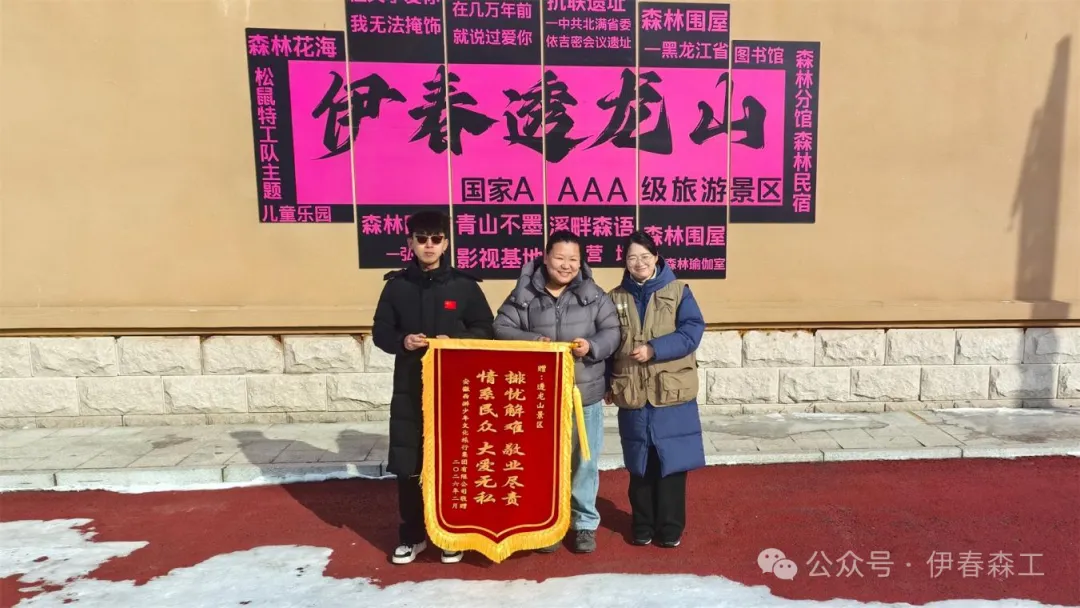 近日,安徽西游少年文化旅行集团有限公司亲子营研学团领队来到伊春森工铁力林业局公司透龙山景区,将一面承载着感谢与认可的锦旗送到景区工作人员手中。这面锦旗,不仅蕴含着对透龙山景区的信任与肯定,更是双方双向奔赴的美好情谊见证。