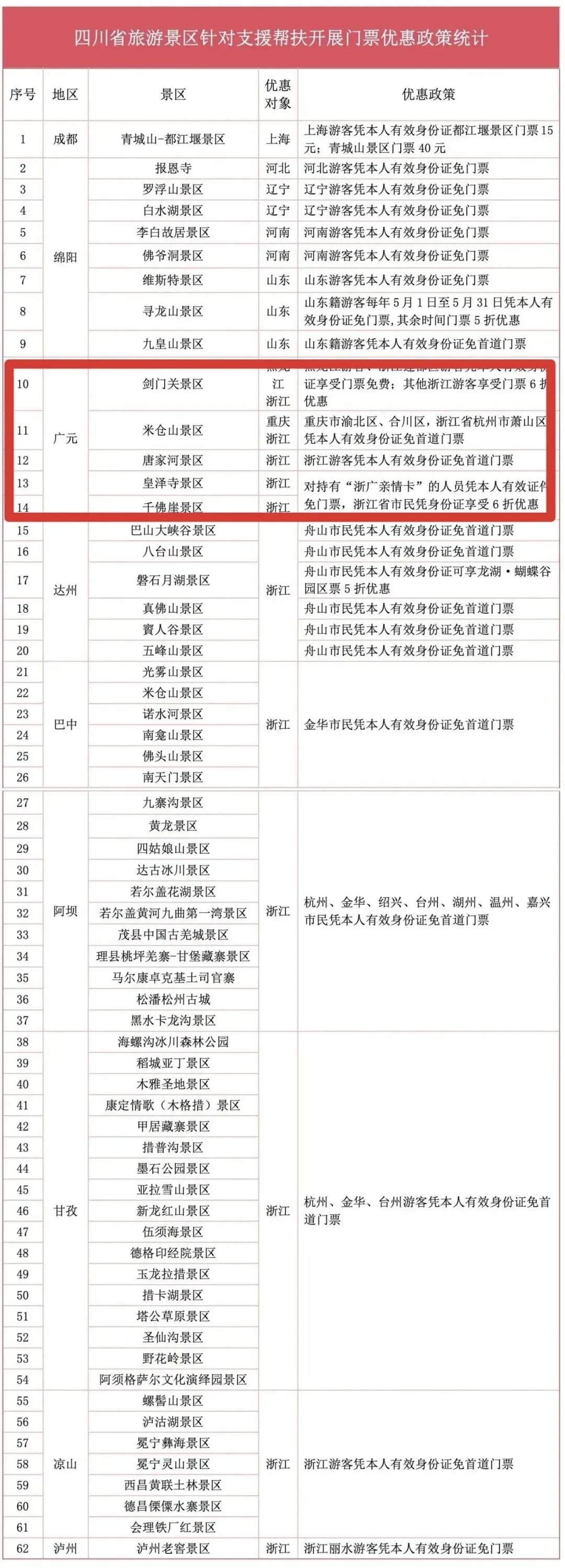 春节期间,广元家A级景区实施感恩门票减免马年春节即将到来,四川文旅特别发布“感恩回馈福利”,为感念汶川特大地震后多个省市对口援建四川以及浙川协作,全省62家A级旅游景区对上海、重庆、浙江、山东、河北、河南、辽宁、黑龙江等地游客实施门票免费或大幅优惠,欢迎帮过四川的亲人们再来看看如今的巴蜀风景。 一省帮一县,恩情重如山,汶川特大地震后,举国千里驰援,与四川风雨同舟、并肩奋战。十八载春秋流转,巴蜀涅槃重生。援建恩情永不忘,四川记心上,免票或优惠票价政策正是真诚和质朴的感恩回馈。 同时,为致谢近年来浙川东西部协作的携手同行,省内多家景区还专门为浙江籍游客推出免票或票价优惠服务,以实打实的福利回馈浙川一家亲的深厚情谊。 黑龙江乡亲游剑门关-翠云廊永久免票、上海亲友逛青城山-都江堰专享特惠、浙江朋友赴九寨沟等四川多地景区免票畅玩……山水依旧,恩情不忘,这个春节,四川等你们回来看看!