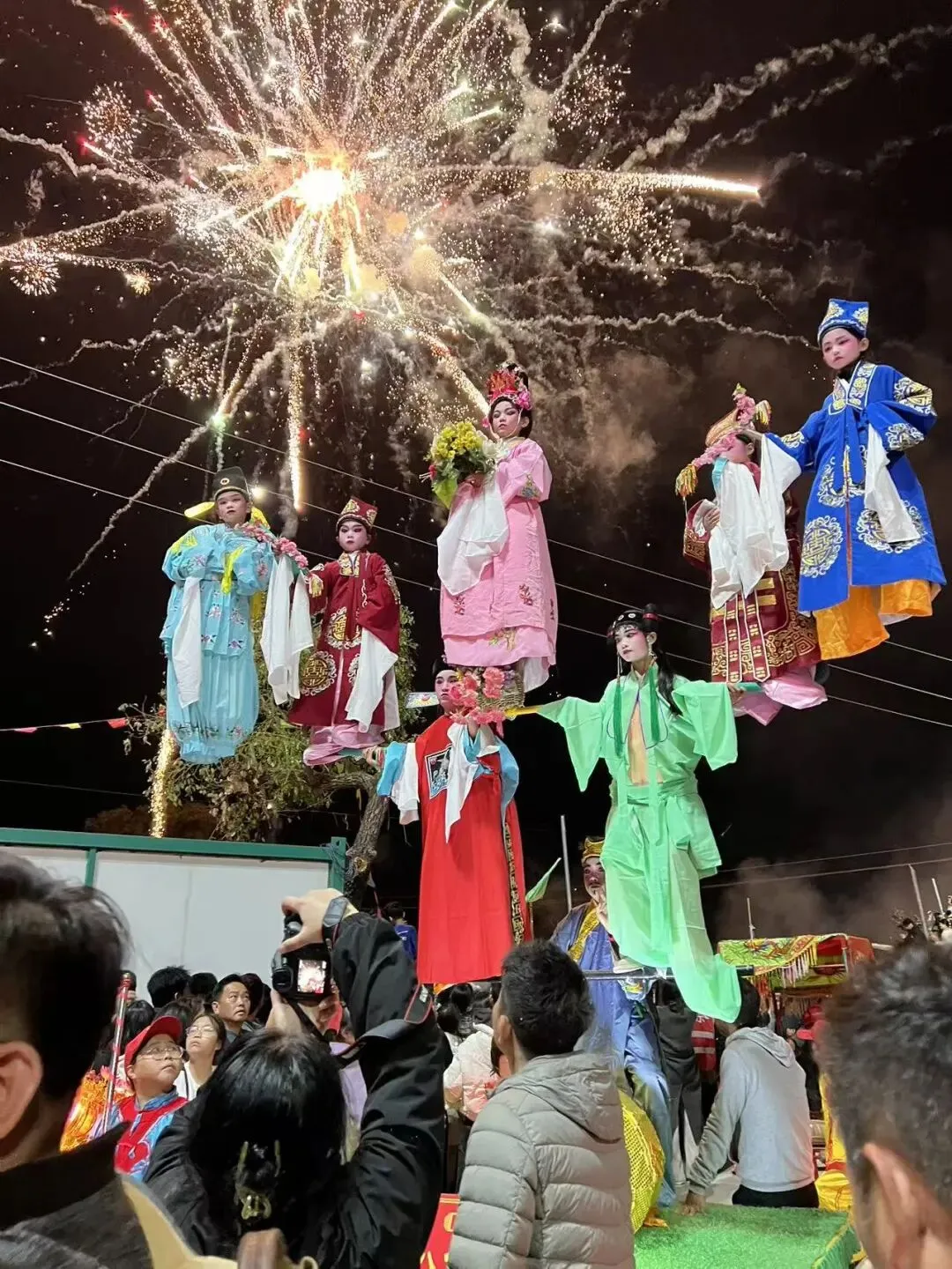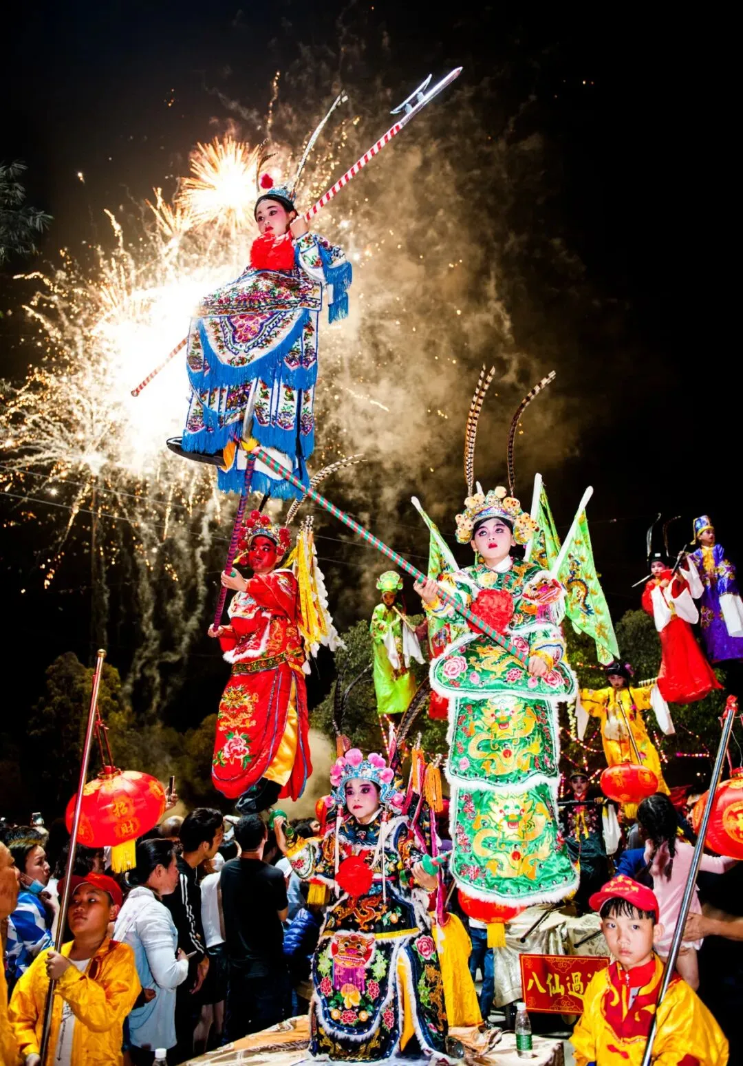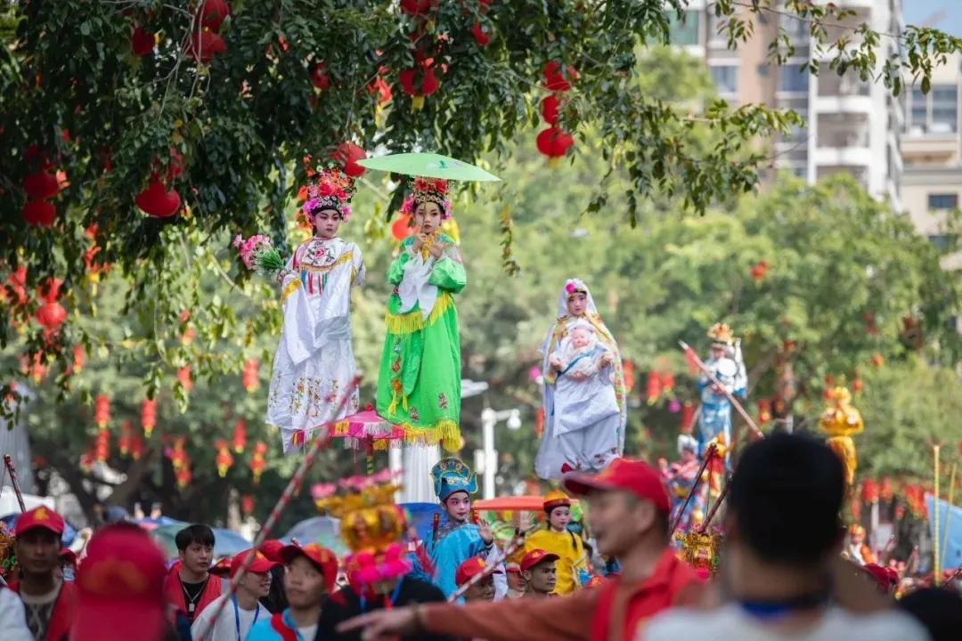 “妆春”寓意迎春纳福、缅怀先祖,是凝聚族人的精神纽带。每年正月十四至十六年例期间,“妆春”巡游便是万众瞩目的盛典——孩童扮作冼夫人、穆桂英等经典人物,立于“春车”或高架之上,以“高、悬、奇、妙”的造型,伴随烟花彩旗,演绎流动的艺术盛宴。