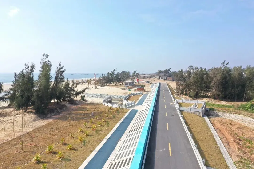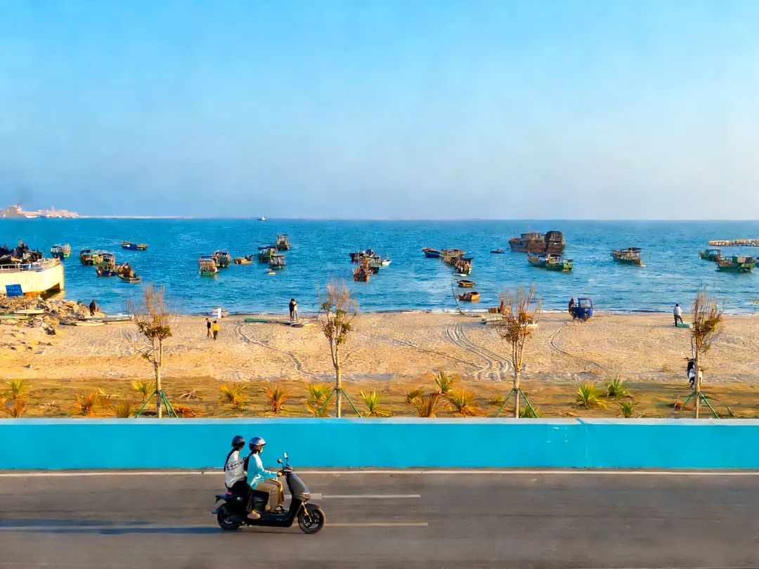 海堤旁,一条宽阔的道路沿着海岸线蜿蜒伸展,仿佛一条巨龙守护着这片蔚蓝。路上,不时有骑行者悠然经过,享受着海风拂面的惬意,或是跑步健身的人们,在这天然氧吧中挥洒汗水,活力满满。远处,海面上渔船点点,与沙滩上悠闲散步的游客构成了一幅和谐的画面。沙滩上,新栽的小树随风摇曳,为这片景致增添了几分生机。而当夕阳西下,天边染上了金黄色,整个海堤更是被笼罩在一层温暖的光辉中,美得令人心醉。
