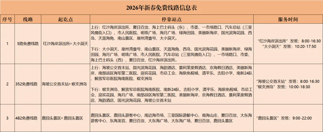 新春佳节,三亚公交再加码,2月15日-2月23日开通3条免费公交线路(5路-双层巴士、352路、482路),覆盖热门景区与城区要道,兼顾便民与旅游需求,让市民游客免费畅享便捷出行!