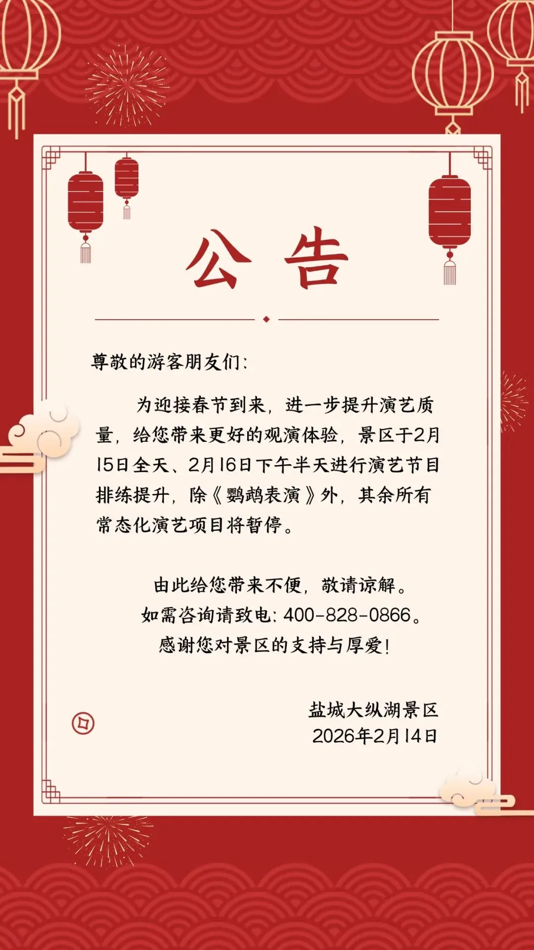 您现在的位置是:首页 > 国内旅游目的推荐 > 正文 国内旅游目的推荐 关于2.15/16大纵湖景区演出暂时停止的公告 admin2026年02月15日 16:09:21国内旅游目的推荐7 关于2.15/16大纵湖景区演出暂时停止的公告来源:大纵湖景区责编:程雨婷初审:陈 琪终审:陈文娟点分享点收藏点点赞点在看 转载请说明来源于"旅荐网",部分内容转载自网络,如有侵权请联系qlwl@foxmail.com删除 本文地址:https://www.15386.cn/post/108197.html 上一篇 山西旅游必去10大景点,去过3个堪称旅行达人! 下一篇 金湖一知名景区 闭园公告! 相关文章 【旅行避坑指南】三招教你识破黑导游!这些套路千万别上当! 小众宝藏·玉林旅游攻略 赶紧码住!江苏苏州超详细旅游攻略来啦! “此时秦皇岛正好·蔚蓝海岸杯”冬季旅游短视频与攻略创作大赛完美收官,第五轮获奖名单公示! 重庆3晚4天自由行-第一次去重庆旅游必看攻略 桂林阳朔三天两夜旅游攻略 旅游指南第105期《平潭3月14日出行速报 | 天气:晴 | 追泪概率:高 | 附赶海潮汐表&日落时间》 西北大环线|9个封神景点+保姆级攻略| 彭州被央广经济之声点名啦:“旅游规划超前”,获大赞! 本J人对自己做的扬州旅游攻略很满意 发表评论 取消回复 评论列表 这篇文章还没有收到评论,赶紧来抢沙发吧~
