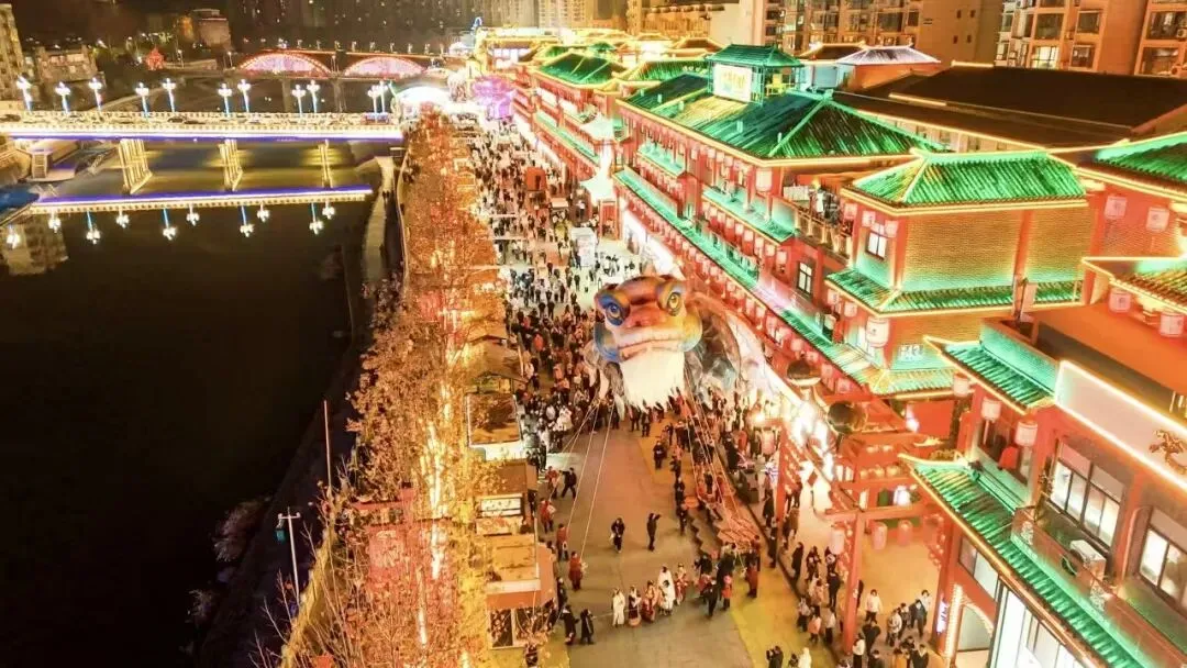 花灯全部点亮,新春光影秀试映,古街在灯光映衬下宛如穿越回旧时,提前感受元宵灯会的雏形;
