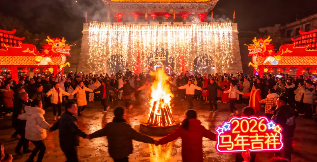 零点篝火晚会高潮不断,傩舞、喷火、变脸齐上阵,冷烟花瀑布点亮夜空,千人共舞迎马年,仪式感拉满。