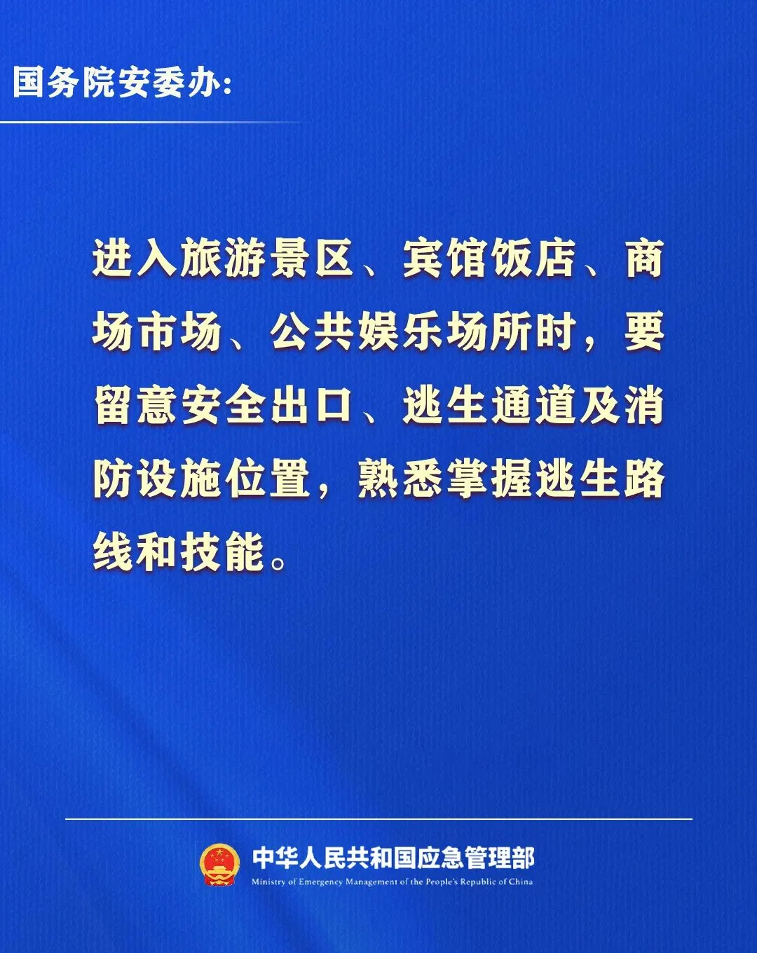 ●进入宾馆、洗浴、酒吧、KTV等公共场所时,留意观察应急疏散路线、消防器材位置、安全出口位置及畅通情况。遇到火灾时要沉着冷静,按疏散指示标志方向就近寻找安全出口,配合工作人员、消防广播指引迅速有序逃生或避险。