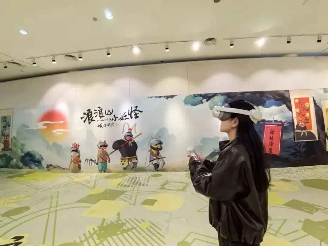 位于潍坊市图书馆四楼的《浪浪山小妖怪:妖你同行XR》对外开放体验。体验者佩戴VR设备,即可“穿越”至水墨国风渲染的浪浪山幻境,自由行走于双狗洞、小雷音寺等经典场景。王鲁萍 摄