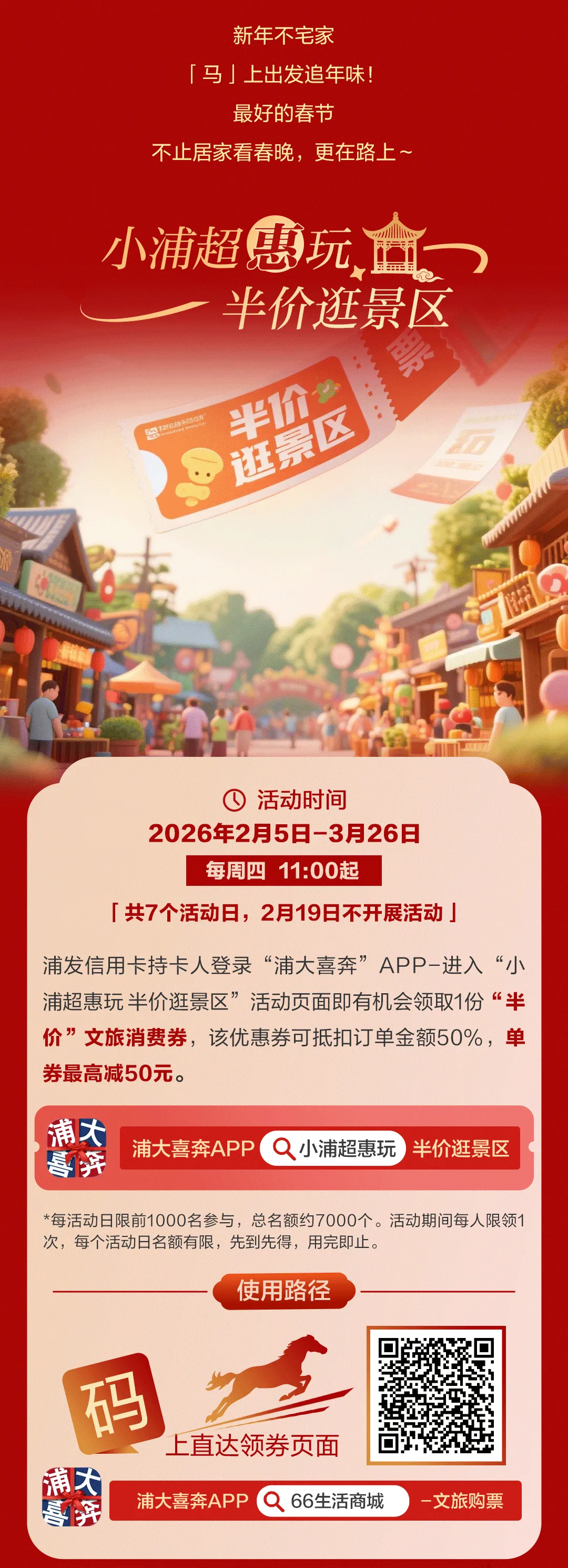 浦发年味很行」佳片1元购、半价逛景区、半价享美食,快乐与你马上同行!