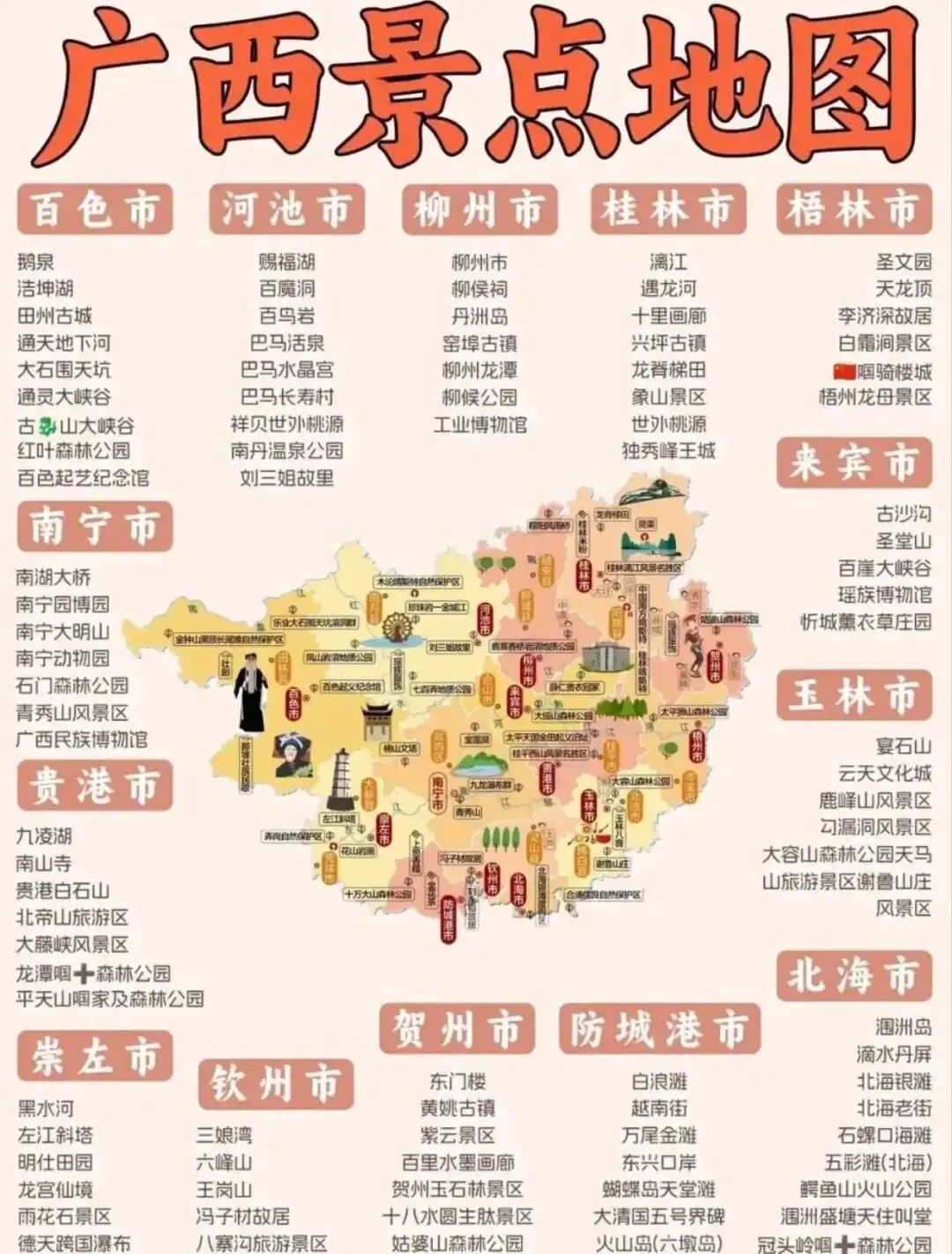 地貌风光:中国喀斯特地貌的「天花板」,漓江两岸峰林挺拔、江水如镜,阳朔十里画廊、巴马百魔洞堪称地质奇观;同时坐拥北海银滩等优质海滨,山水与海岛相映成趣